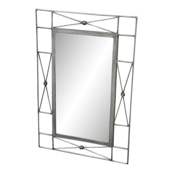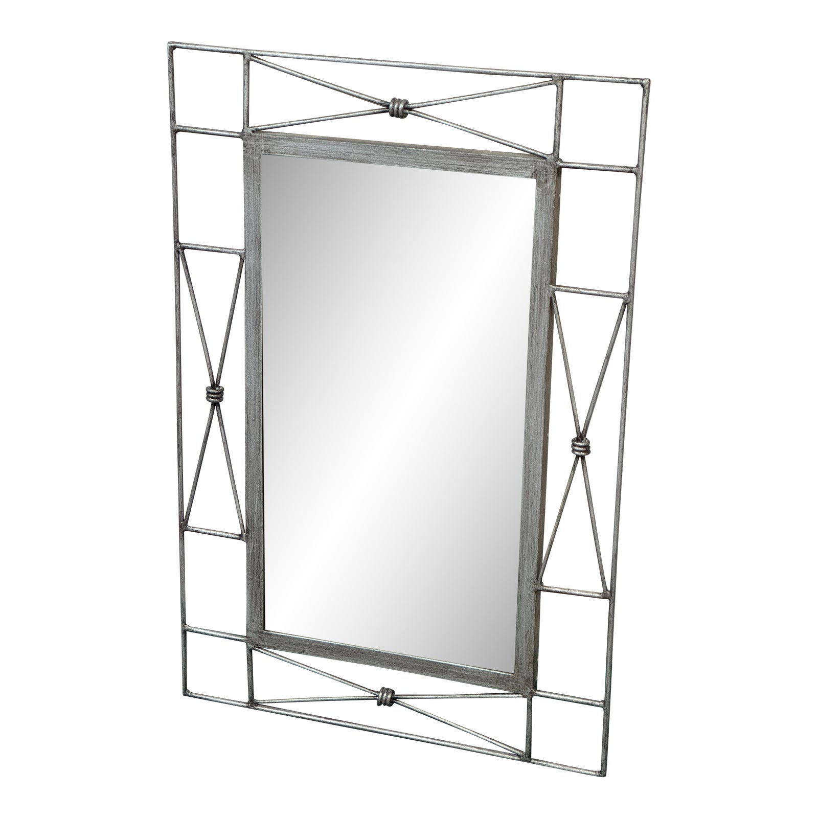 Design Plus Gallery presents a Late 20th Century Medici Wall Mirror by Pier 1. Features an iron frame with a vintage pewter finish, giving it a stylish and contemporary look. The center of the mirror is a large reflective surface, surrounded by an outer frame adorned with intricate x motifs with center metal bindings. This wall mirror is not only functional but also a work of art that will elevate the décor of any space. Visible and minor wear from usage + age. This is a discontinued model.