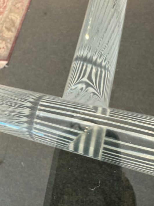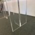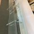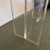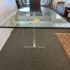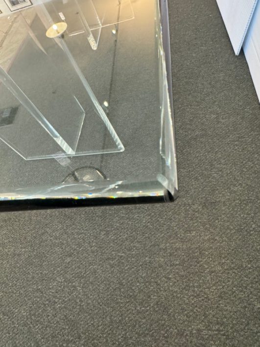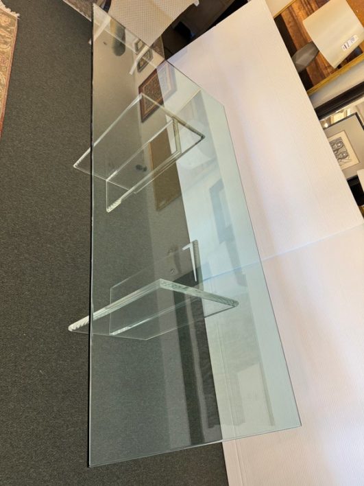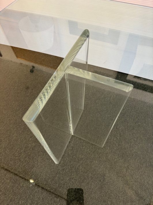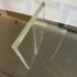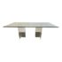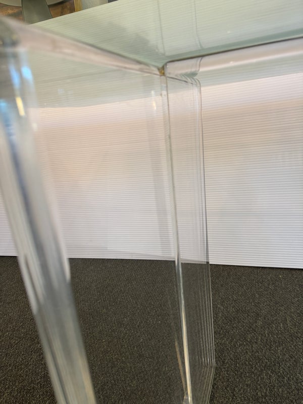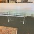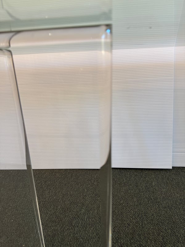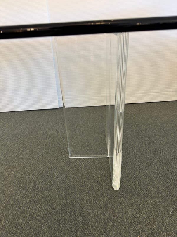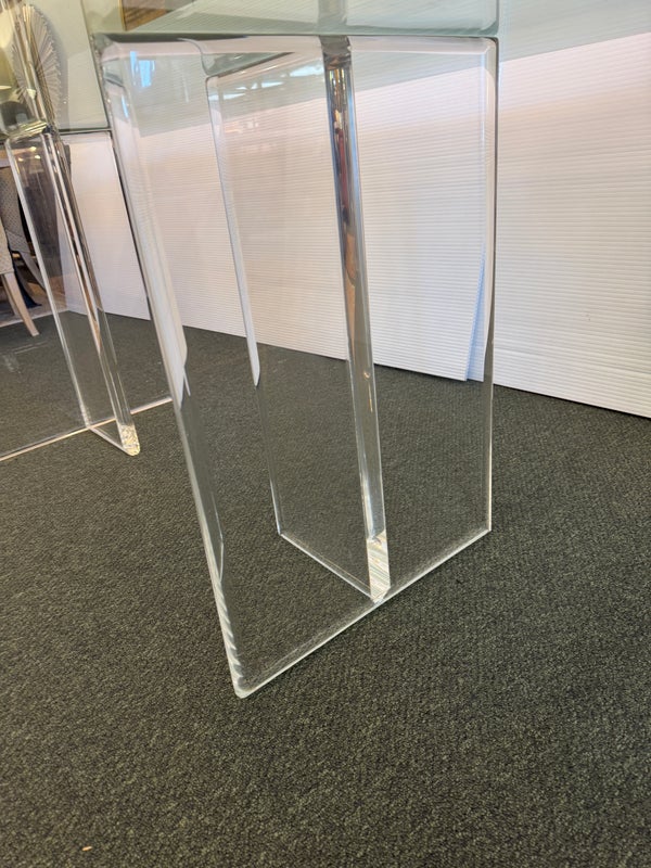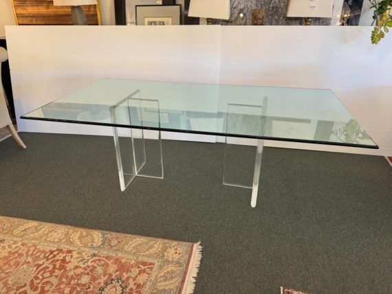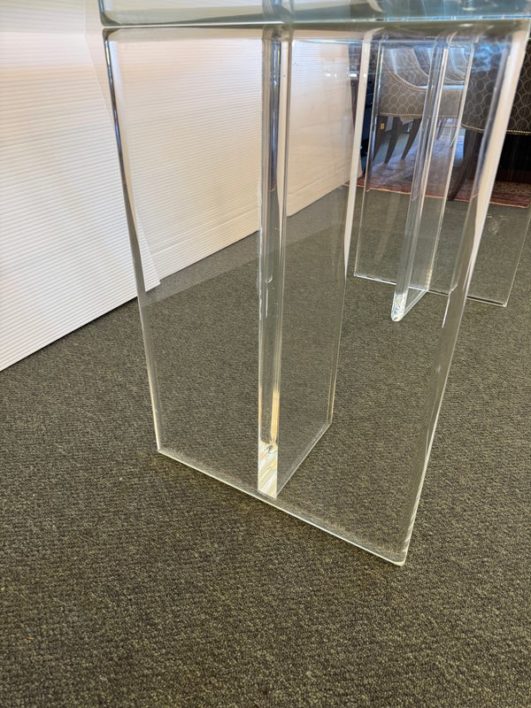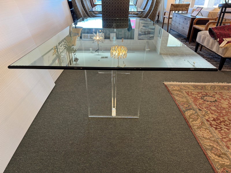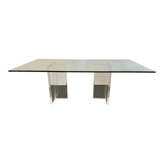 Design Plus Gallery presents a Modern Dining Table. Clean T-silhouette pedestals in clear lucite elevate this timeless design, they can be flipped around and moved to suit your fancy. The 3/4 inch expanse of glass is cleanly finished with a bullnose edge. No chips or deep scratches; the condition is good for age and use.