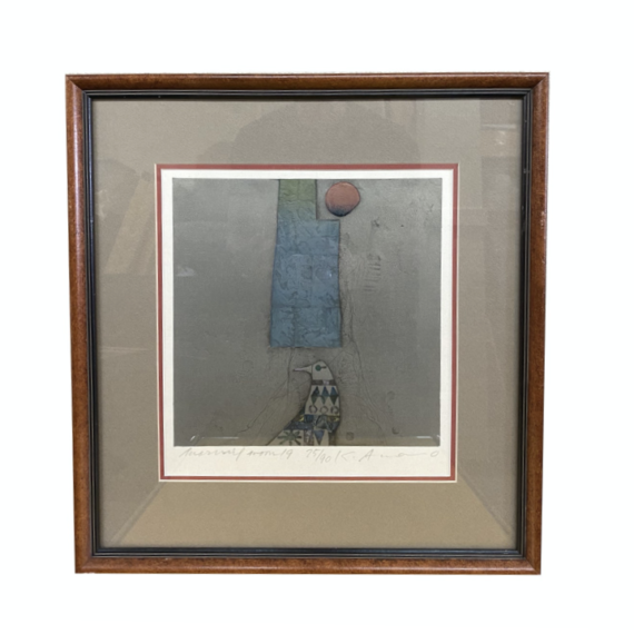 Design Plus Gallery presents a “Morning Moon 19” Ltd. Edition Embossed Screen Print. Signed and marked with the edition by the artist at the base of the art piece. Custom framed with double matte in a Chestnut stained frame with a champagne matte to complement the metallic + embossed quality of the screen print. Bird in silhouette basks in the morning light next to a reflected body of water. Bird has an array of cool toned motifs patterned within body. Little evidence of wear, coordinating Screen print may be available. Numbered 75 out of 90.
