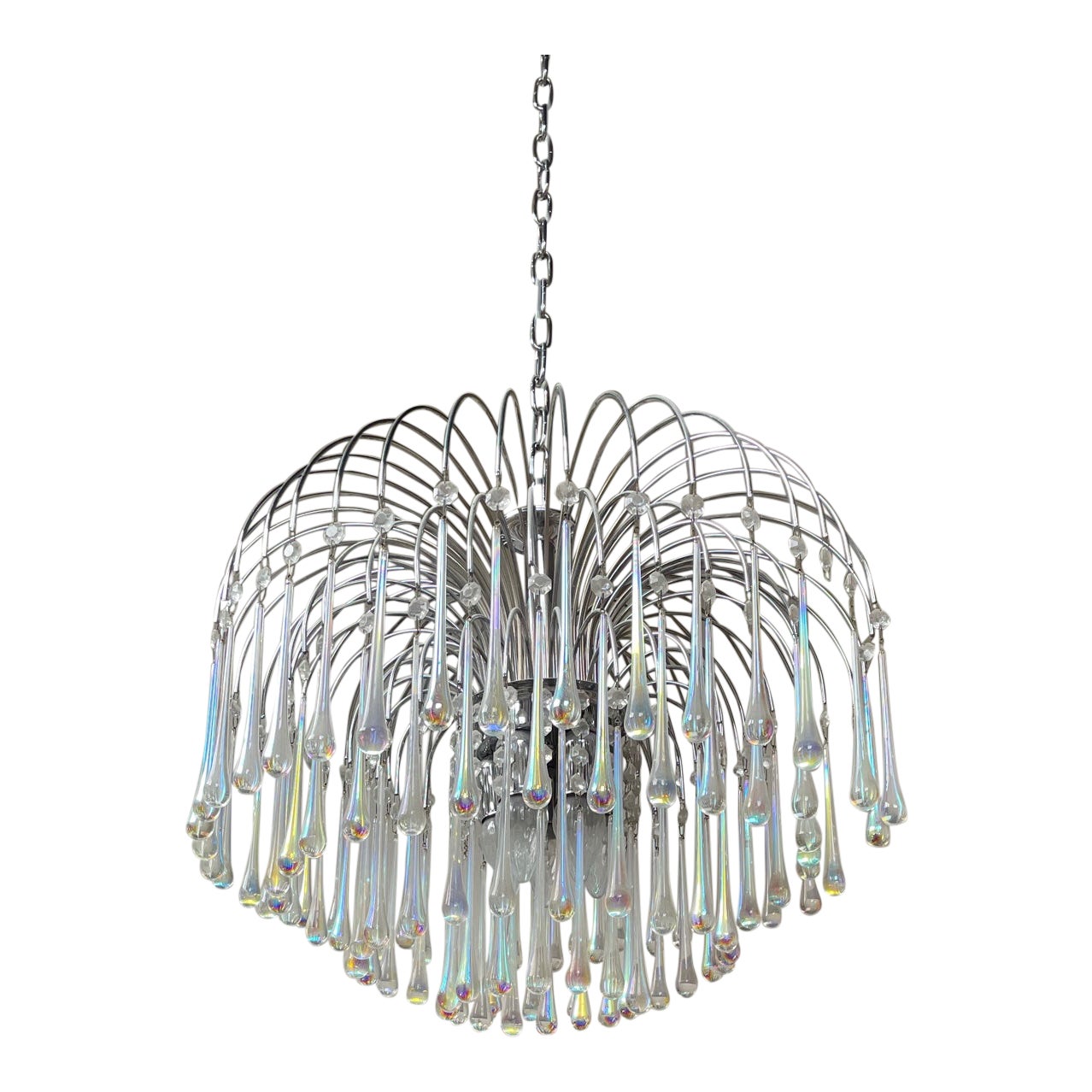Design Plus Gallery presents a Late 20th-Century Murano Teardrop Chandelier. Larger chandelier and sconces might be available. Tear drop glass has an iridescent finish. All are in tact. Frame made of a polished chrome and coordinates with the chain and canopy.