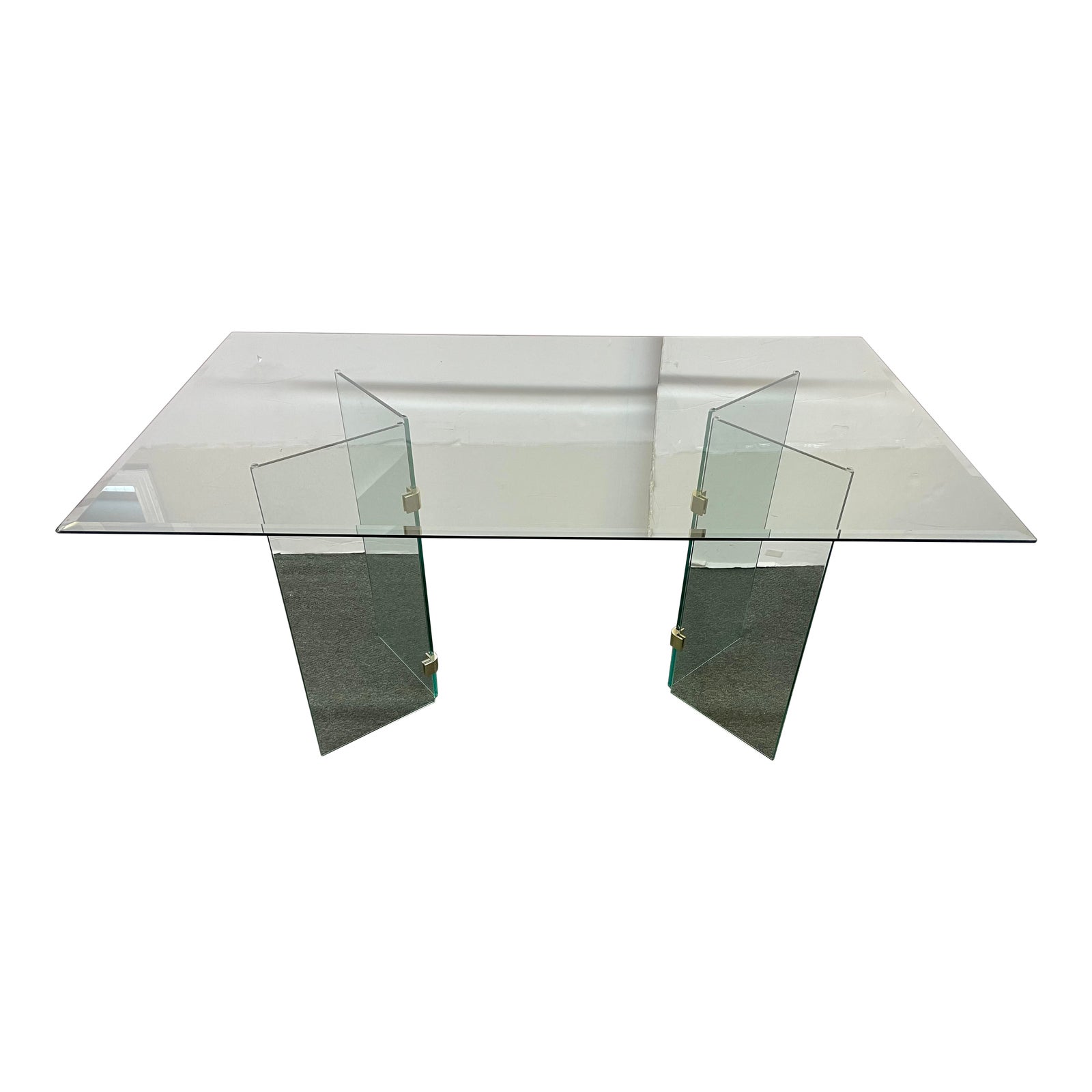 Design Plus Gallery presents a Late 20th Century Pace Collection Style Glass Dining Table. Brothers, Leon and Irving Rosen, created many designs juxtaposing glass and metal. Architecturally minimalist designs became a staple from Pace in the late 70’s blending metallic and glass surfaces. The double pedestal base has a sharp symmetry with a large and expansive beveled rectangular top. Minor wear on surfaces, chip on a corner, table is in good condition.