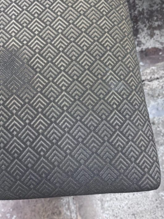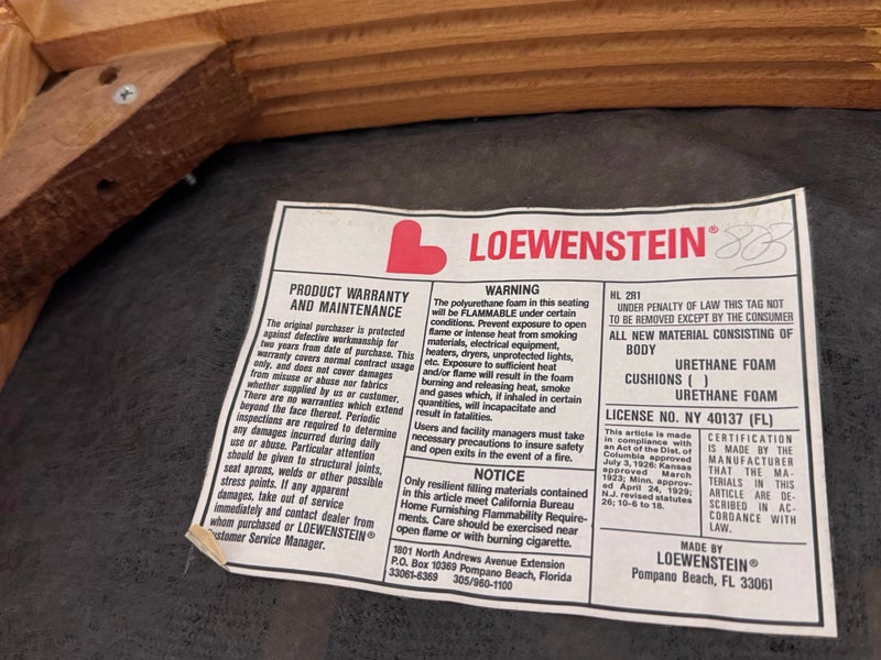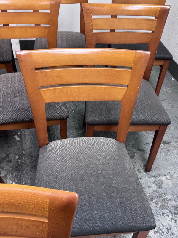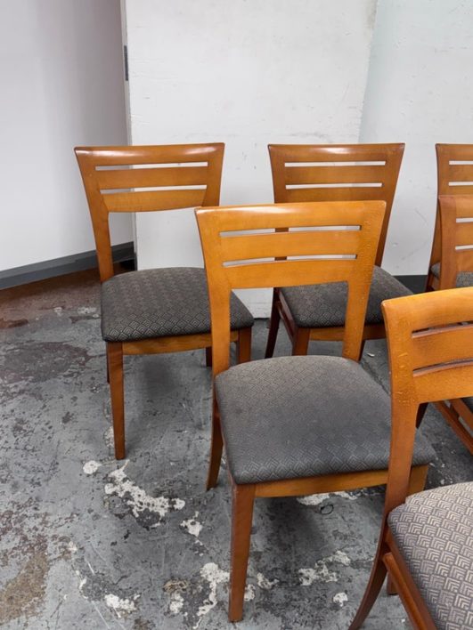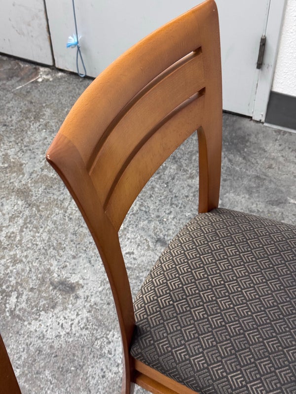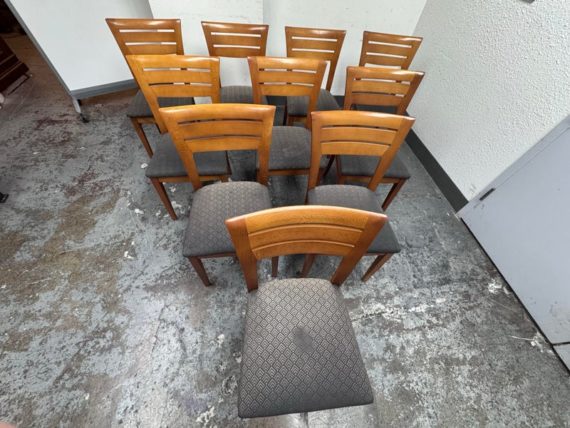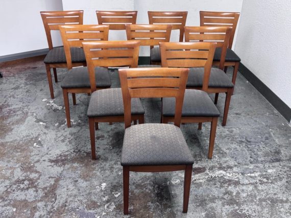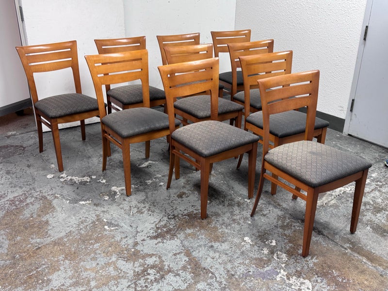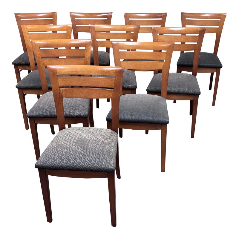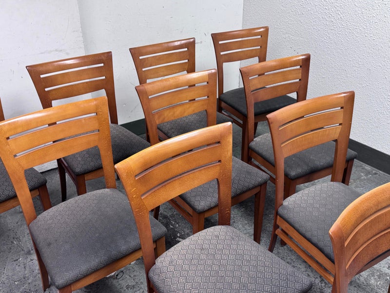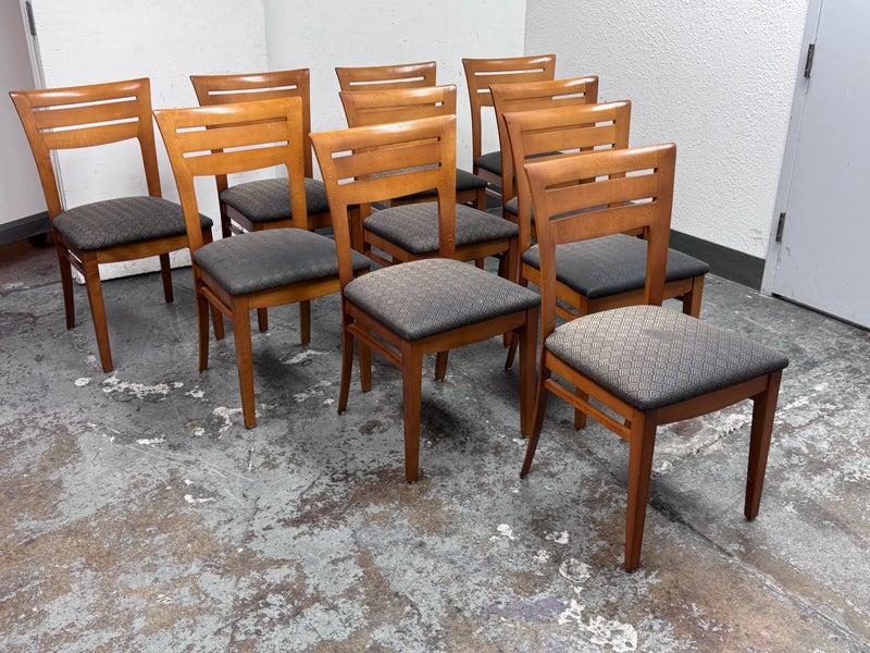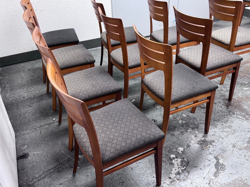 Design Plus Gallery presents a Set of Ten Dining Side Chairs from the Late 20th Century by Loewentstein. The chairs have a post modern design style with a solid cherry wood frame. The upholstered seats have a diamond print in off white/cream. Visible wear is present but overall are still functionally good chairs. The seats would benefit with new upholstery. Made in the USA.