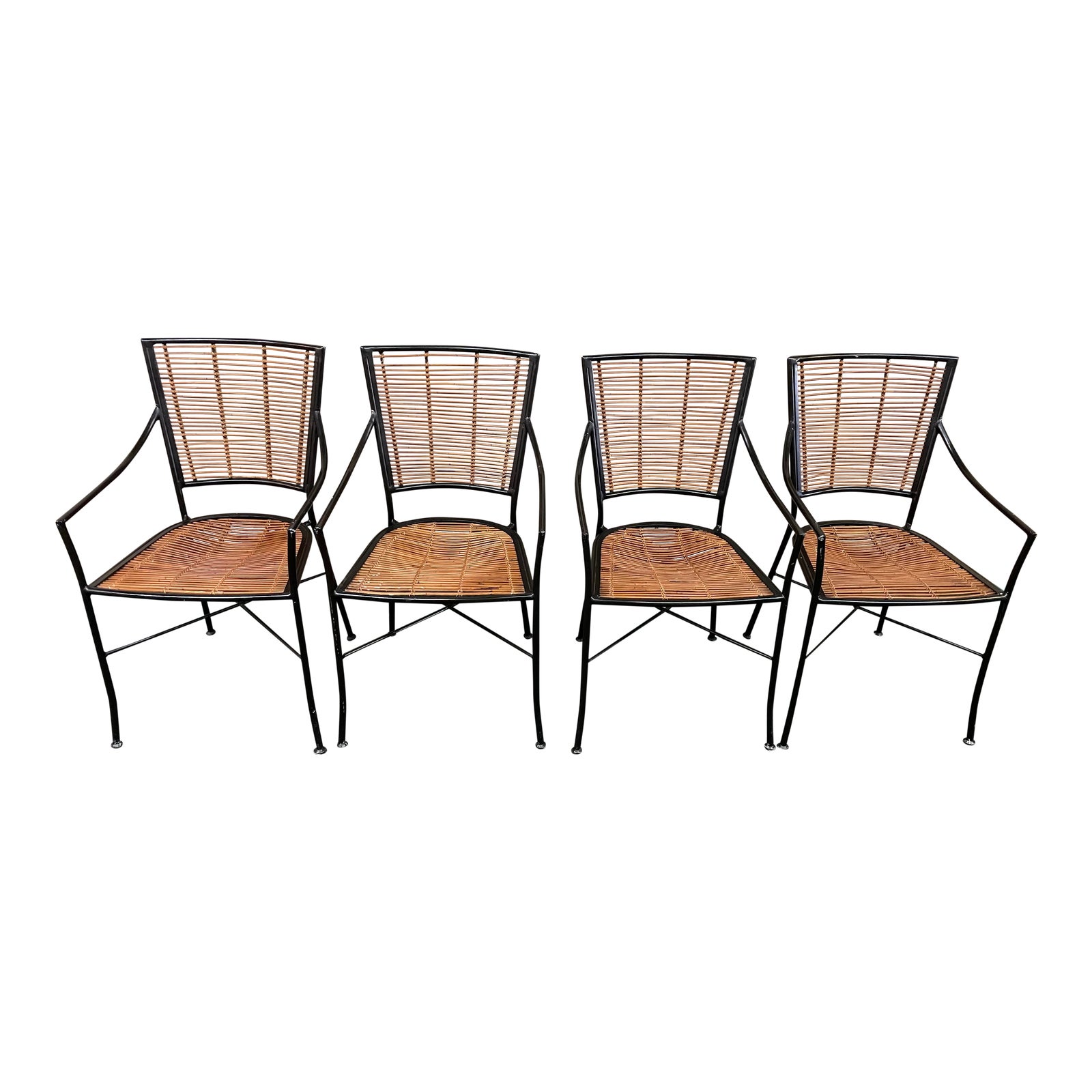 Late 20th Century Rattan + Black Metal Arm Chairs, a Set of Four