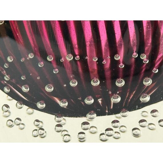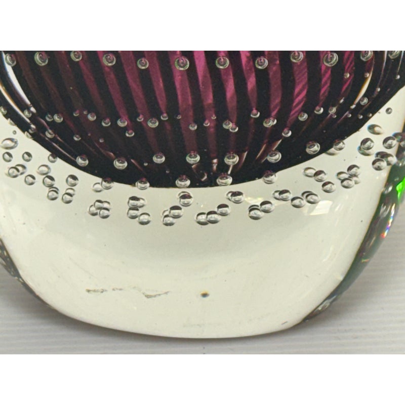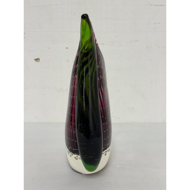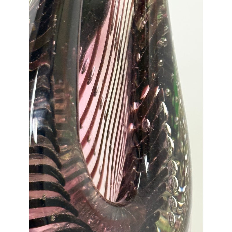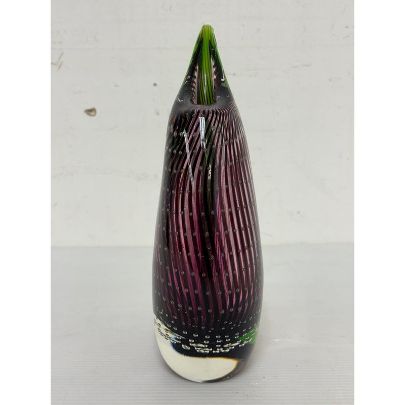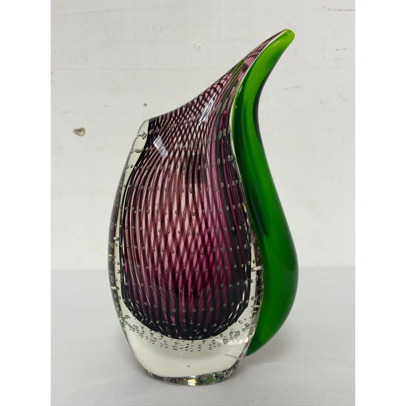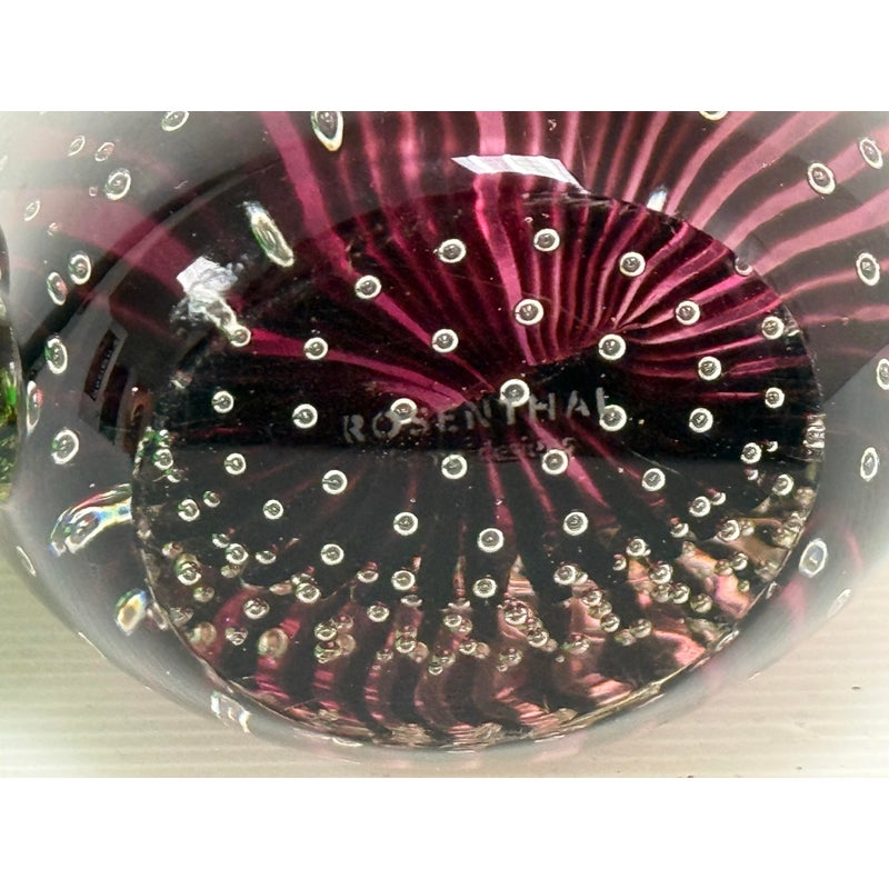 Design Plus Gallery presents a “Dewdrop” Glass Vase from Rosenthal Home/Designs. Featuring green and purple art glass with controlled bubbles. The vase has an asymmetrical, organic shape resembling a dewdrop, with one side taller than the other. In good condition, minimal wear. This is a discontinued model. Made in Germany.