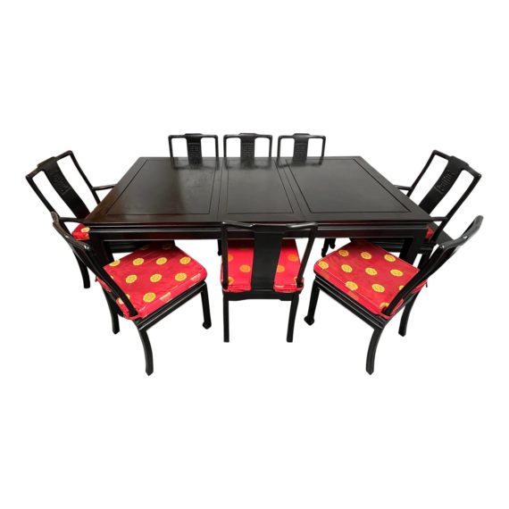 Design Plus Gallery presents a Late 20th Century Rosewood Extension Table Table + Eight Chairs. Rosewood is stained a rich and contrasting black. Table comes with one optional leaf. Dining chairs includes two with arms and each are adorned with carvings on the slender splats. Splats curve in for lower lumbar support. Extension does not glide smoothly, force will be needed. There is visible and minor wear, dining set is in good condition.
