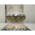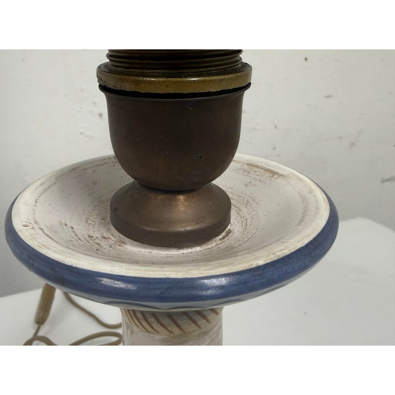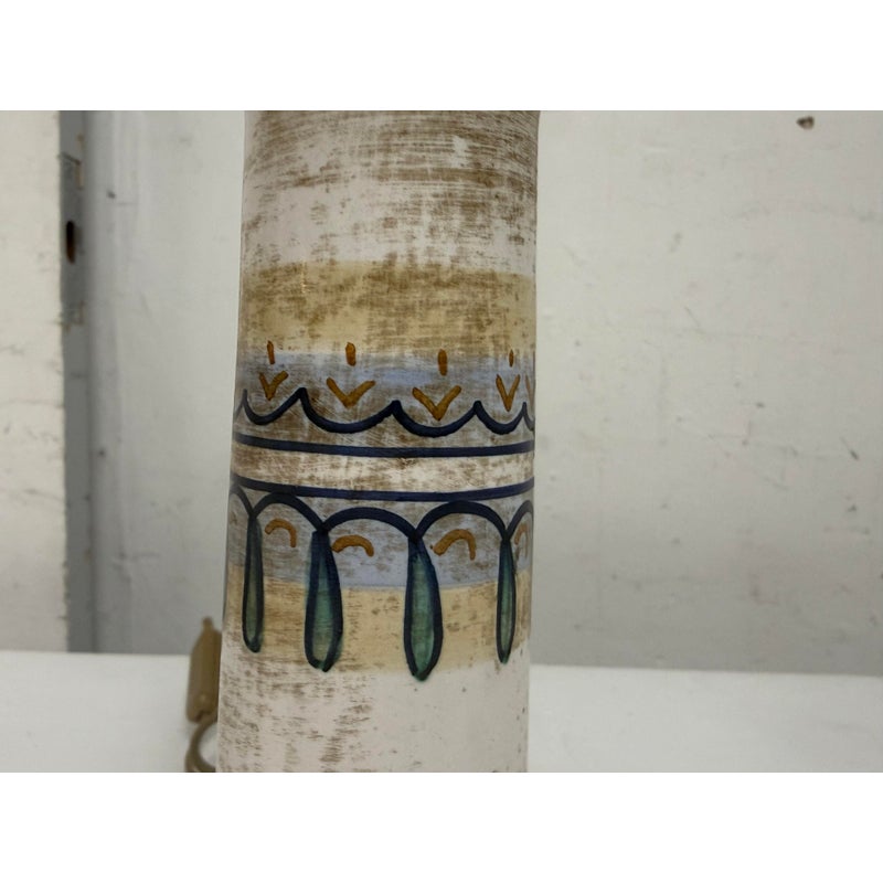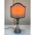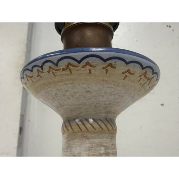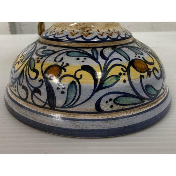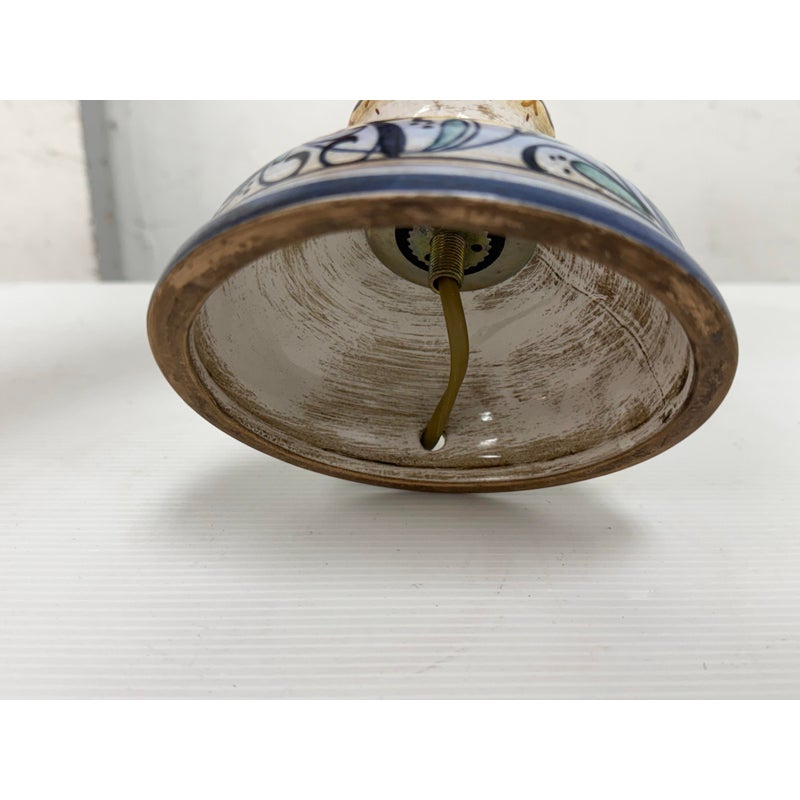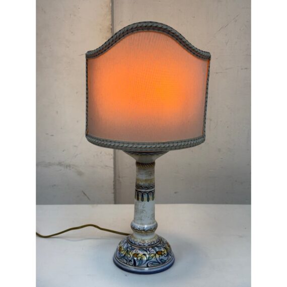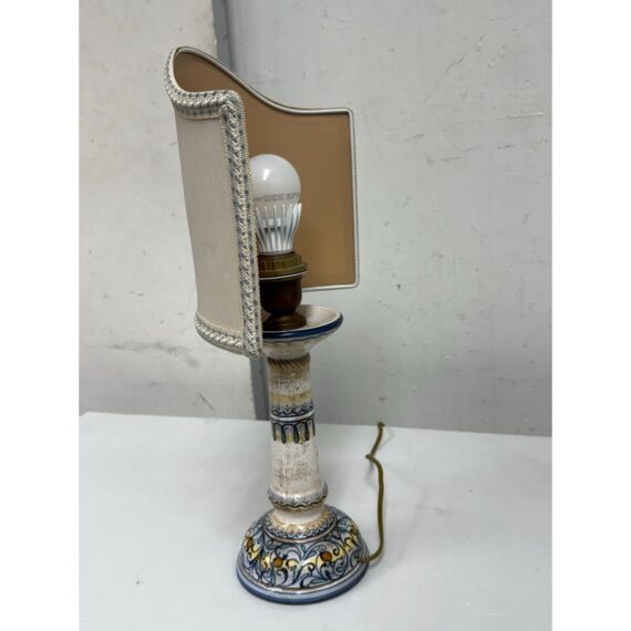 Design Plus Gallery presents a Saca Castelli Italian Table Lamp from the Late 20th Century. This table lamp is made from hand painted duretta ceramic with a candlestick like base. The base is in colors of blue over white and has repeating flowers and leaves at the widest part of the base. There are other filagree on its body and there is a truly spectacular and rare lamp shade that is in the shape of a shield. A true soon to be relic that is signed by the artist with the date. It is in good condition for its vintage age + use.