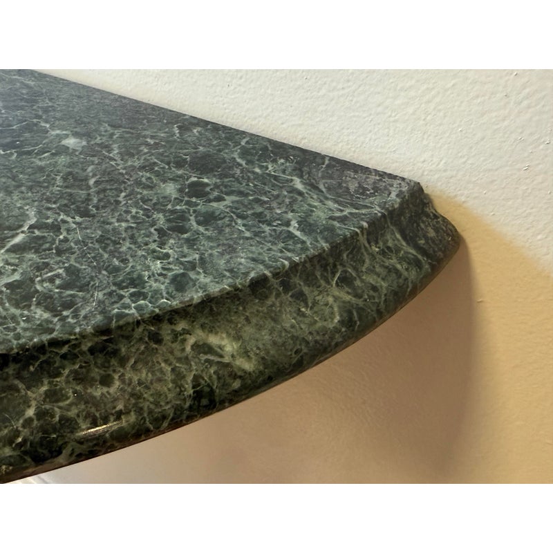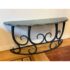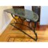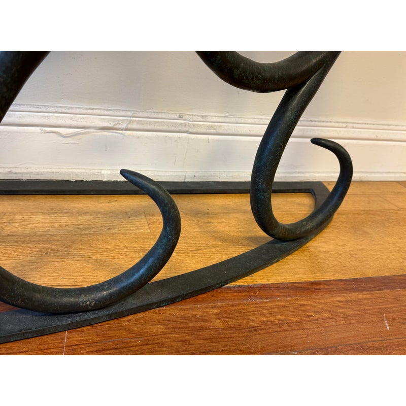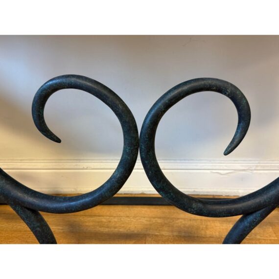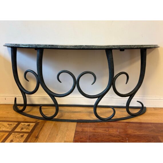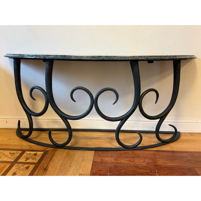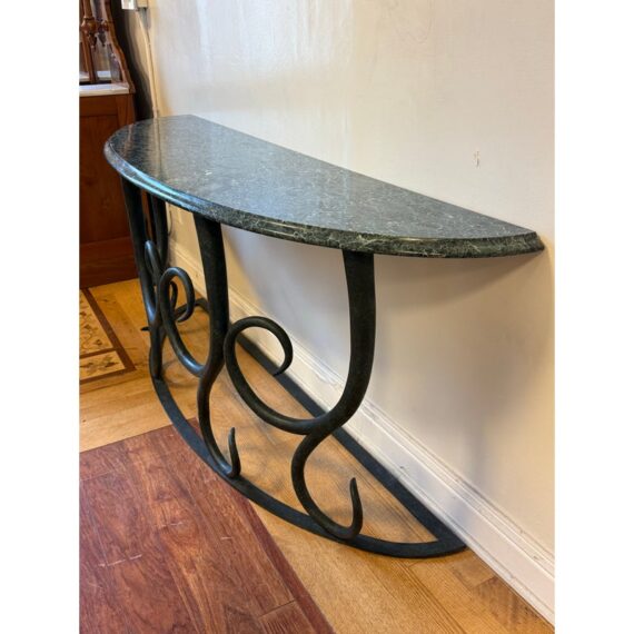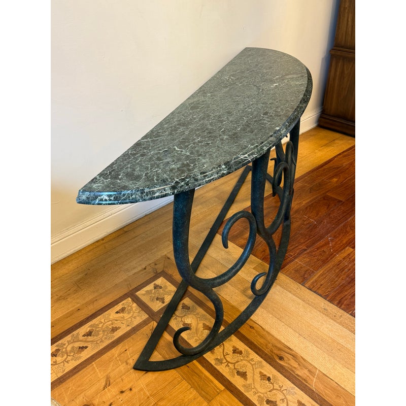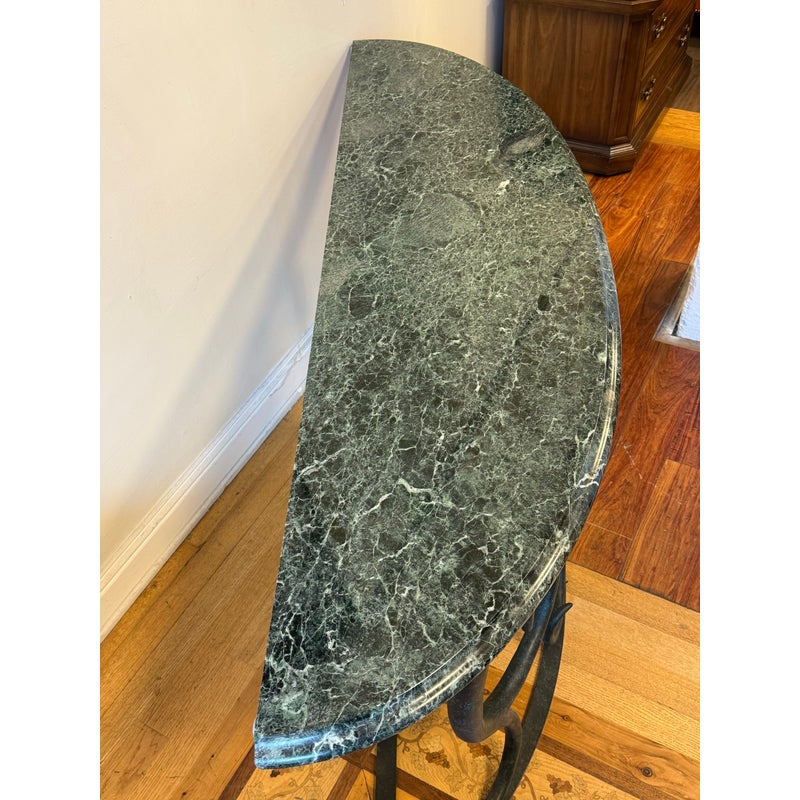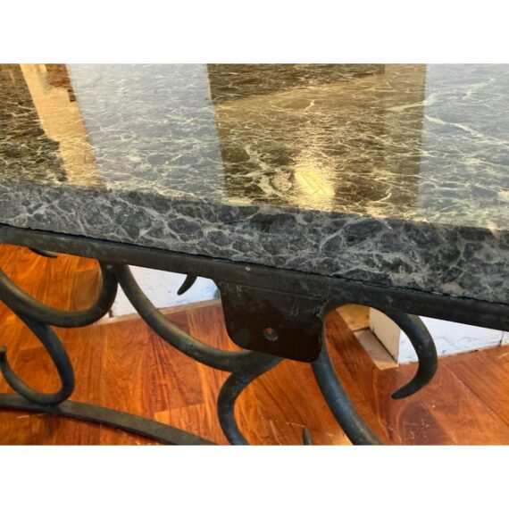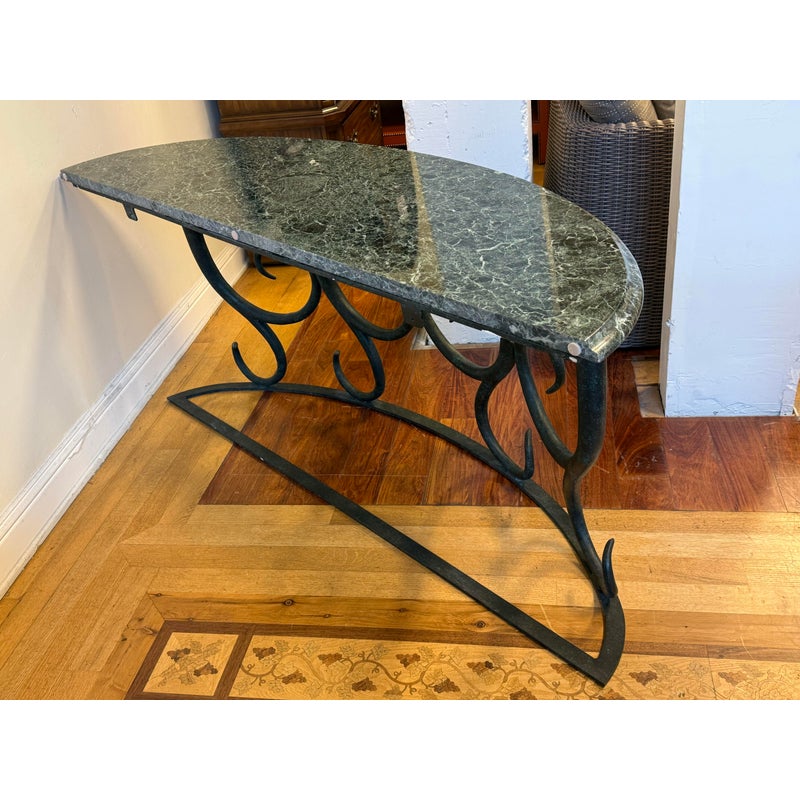 Design Plus Gallery presents a Contemporary Console Table of Curvy Iron Base with Green Marble Top. The marble is also called Indian Green or Oriental Green, Guatemala Green is a serpentine green marble. From its strong arboreal base, numerous very white veins stand out, generating a sharp contrast. Veins and background create an ensemble of great natural beauty and exoticism. The base is finely done as well and offers a green hued patina to it that is common with age. In good condition, visible and minimal wear from usage.