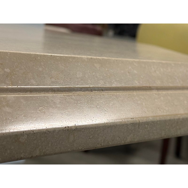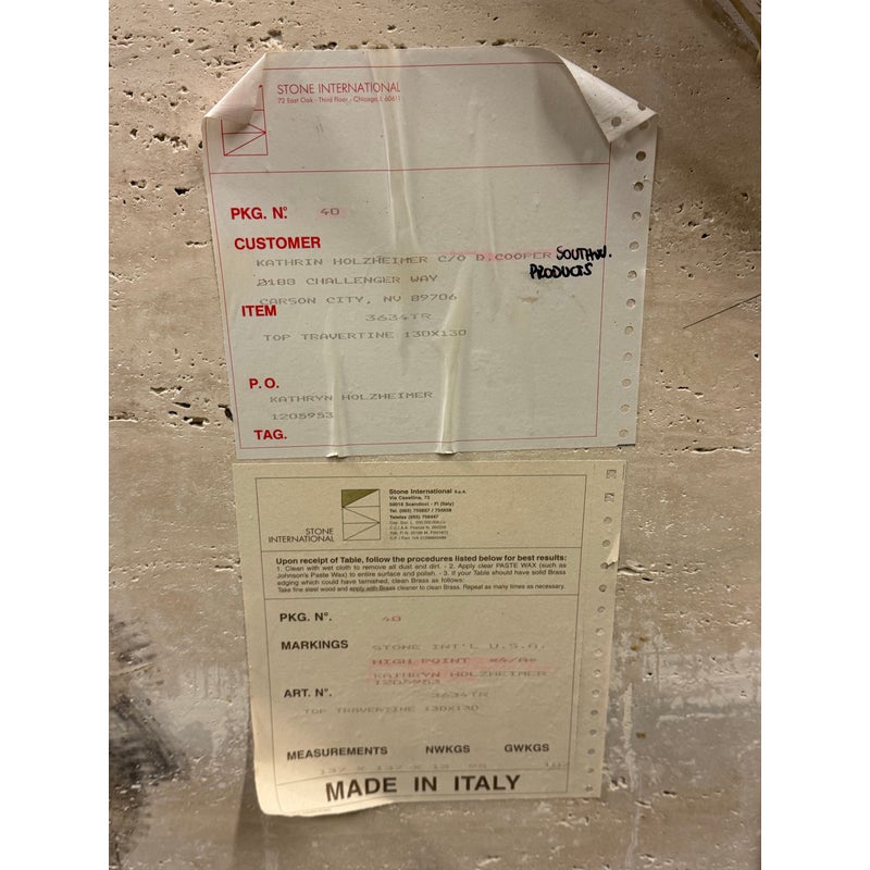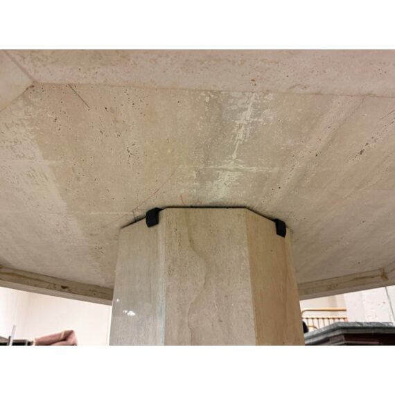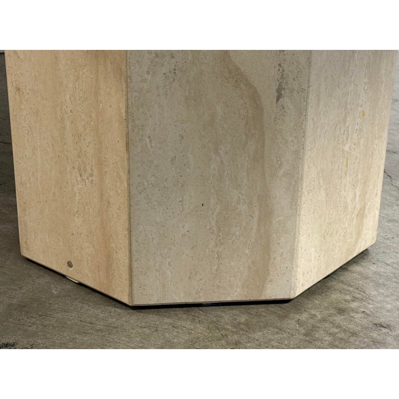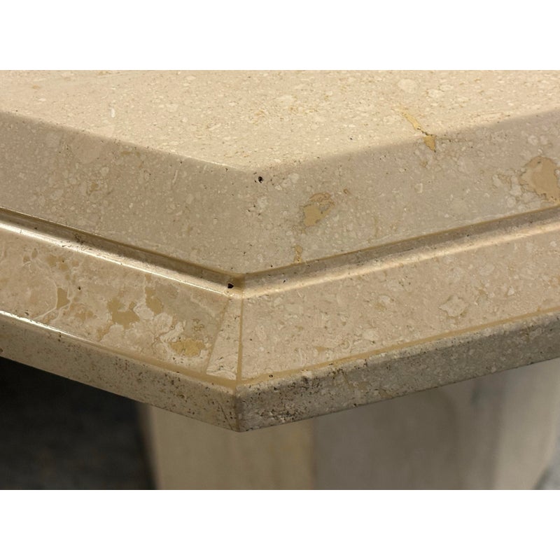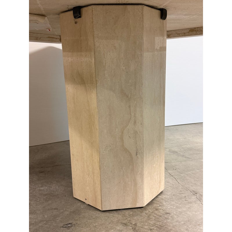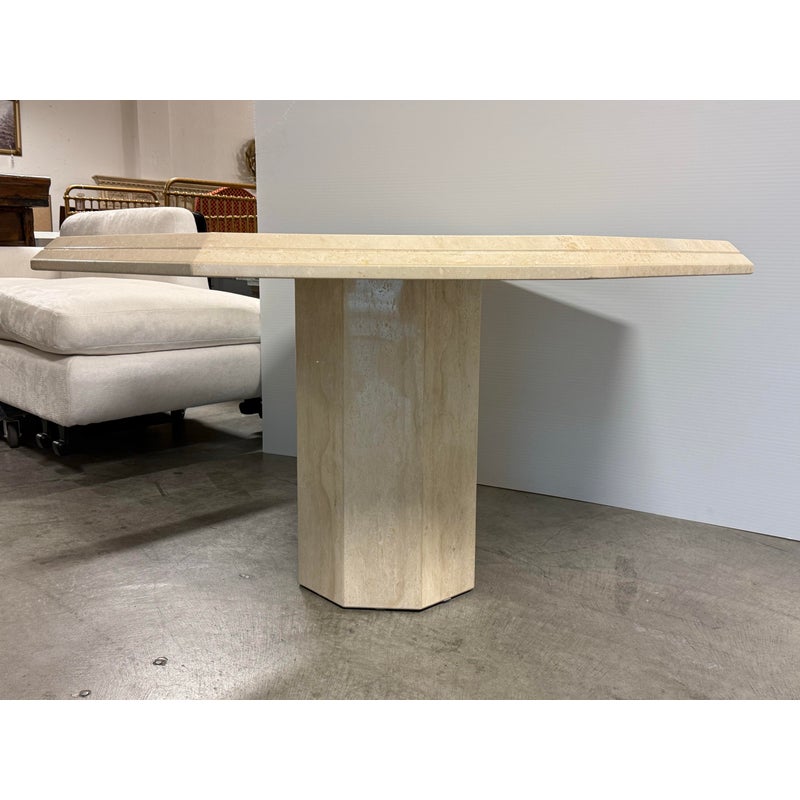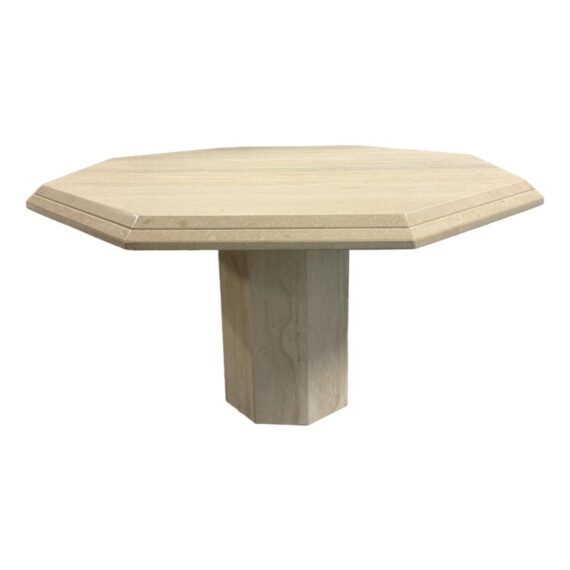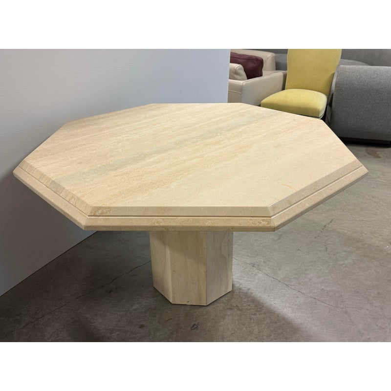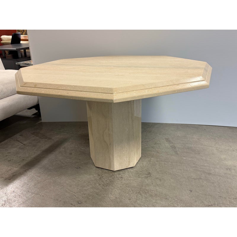 Design Plus Gallery presents an Octagonal Dining Table of Travertine from Stone International. A wonderful, natural table from the late 20th century that gives homage to the Postmodern era while offering timeless appeal, even with today minimalistic design appeal. The table has a beveled edge of finely cut travertine stone with a matching faceted base in the same shape. It can work in a dining area, as a center table, or as a game today. The table shows little signs of wear for its age and is considered to be in good condition. Made in Italy.