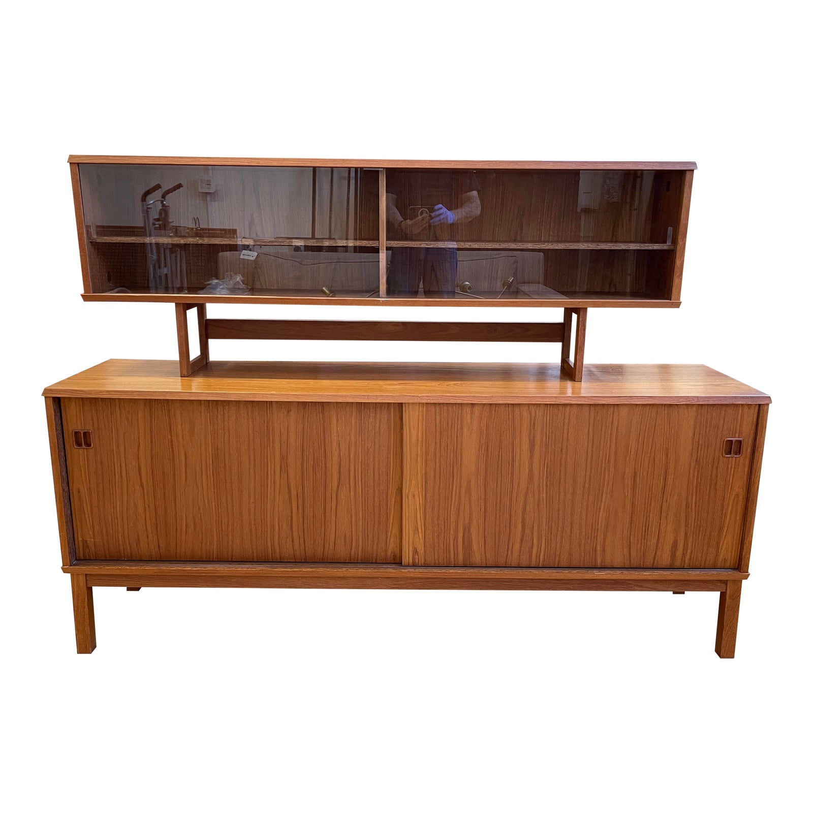 Design Plus Gallery presents a Late 20th Century Teak Sideboard Credenza Hutch. Constructed with solid maple, teak veneers, and particle board. Slider doors keeps space open and efficient. Carved hand pulls have a traditional teak craftsmanship. Shelving on the interior is adjustable. Top display cabinet can be removed. Minor wear through out, unit is in good condition.