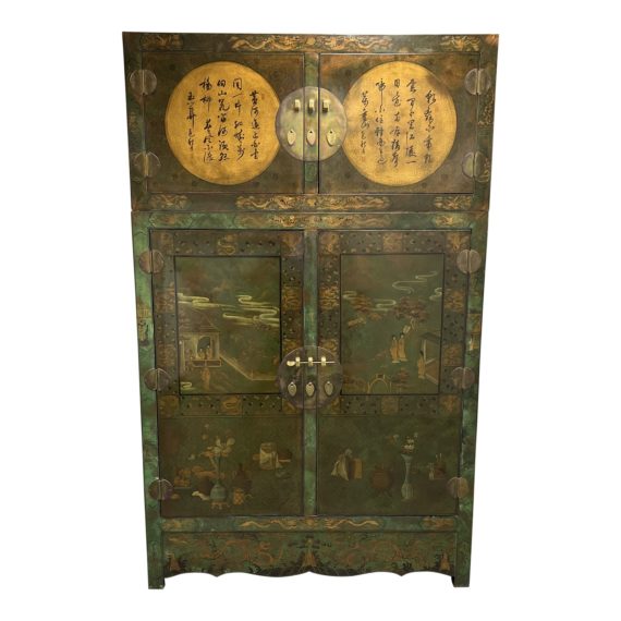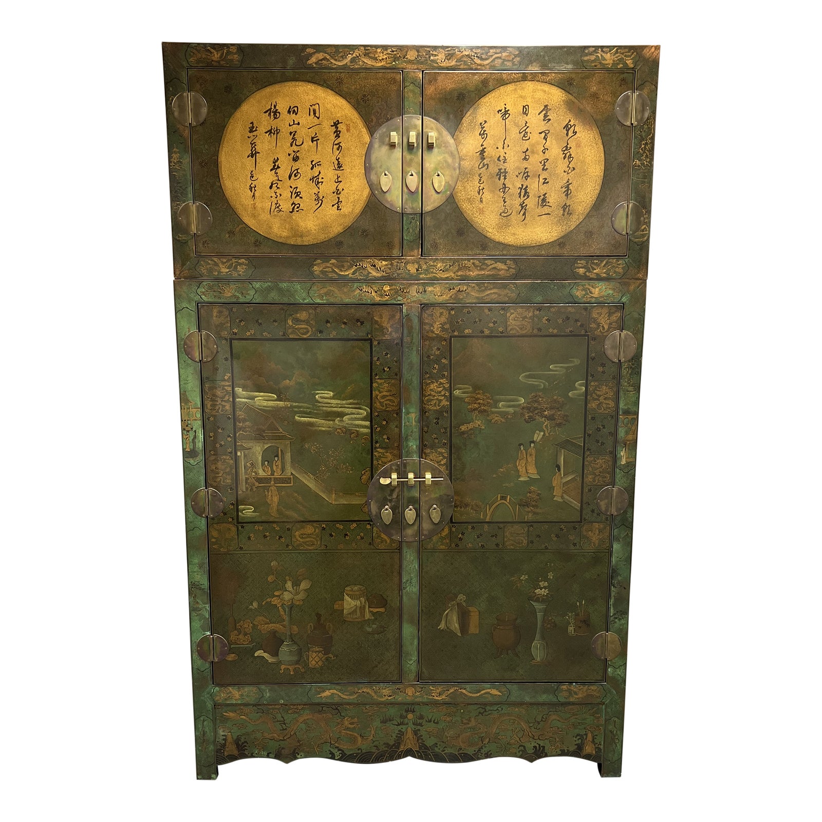 Design Plus Gallery presents a Late 20th Century Two-Piece Asian Green Lacquered Cabinet. Top piece stacks in a Tansu fashion. The exterior of the units are richly hand painted with bronze and green and the interiors are a crisp black. Bronze hardware accents further layer in this beautiful work of art. There is minor wear through out, unit is in good condition. Is missing one original pin for the door.