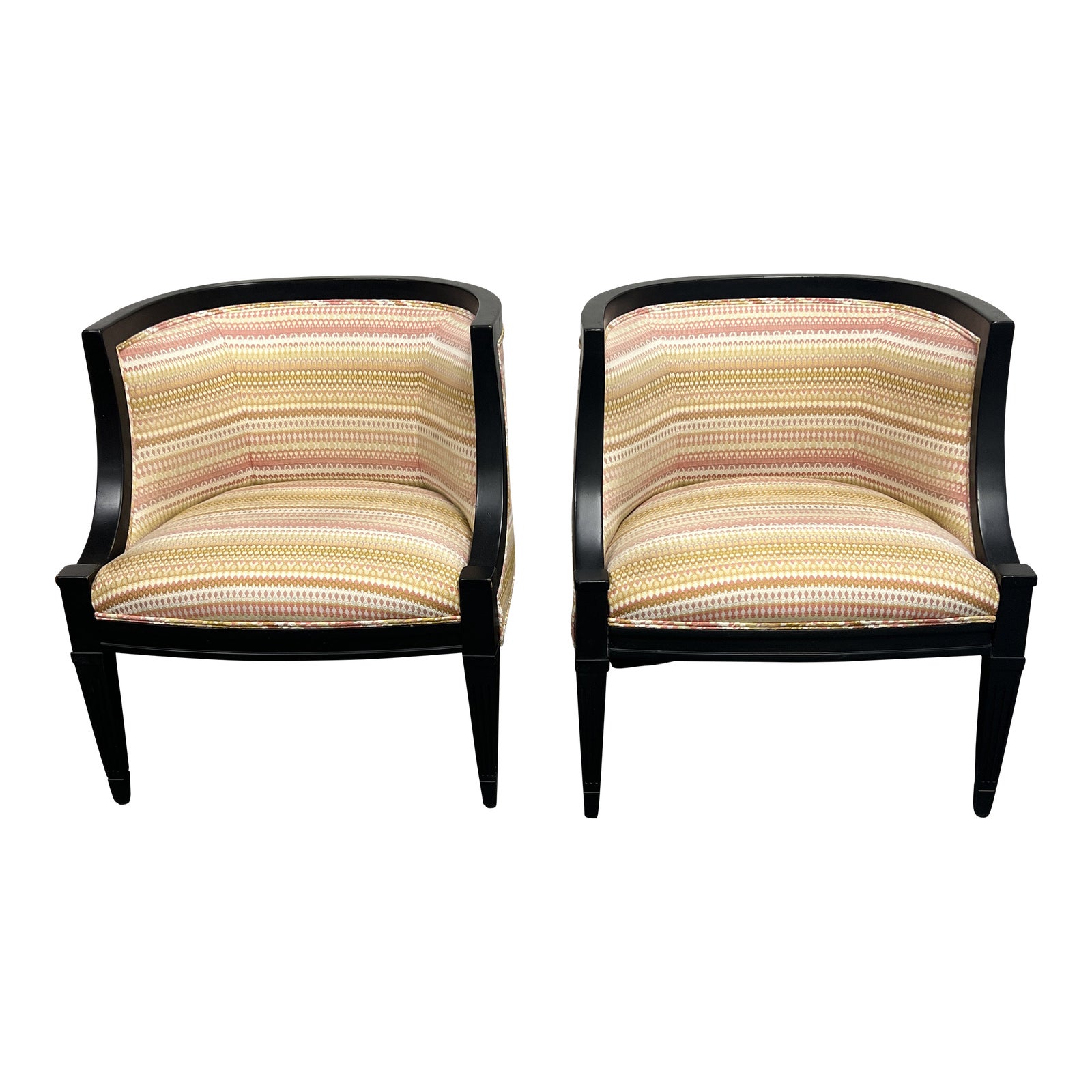 Design Plus Gallery presents a Pair of Late 20th Century Vintage Reupholstered Barrel Chairs. The frames are constructed with wood and given a black finish. The front legs are square with a taper; the back legs are square with curve accents. The upholstery covers the barrel back and the front, with welting accents included. Visible+ minor wear from age + use; chairs are in good condition.