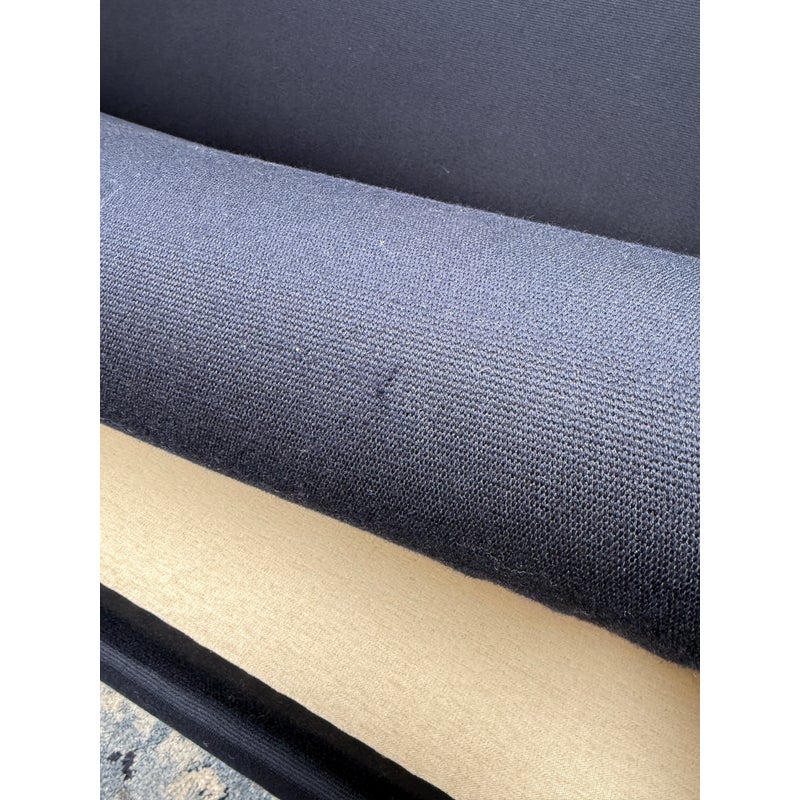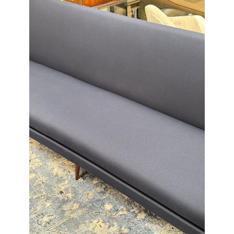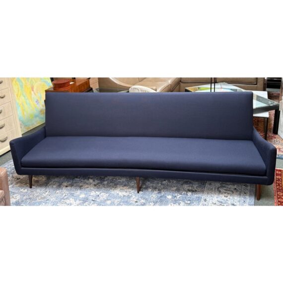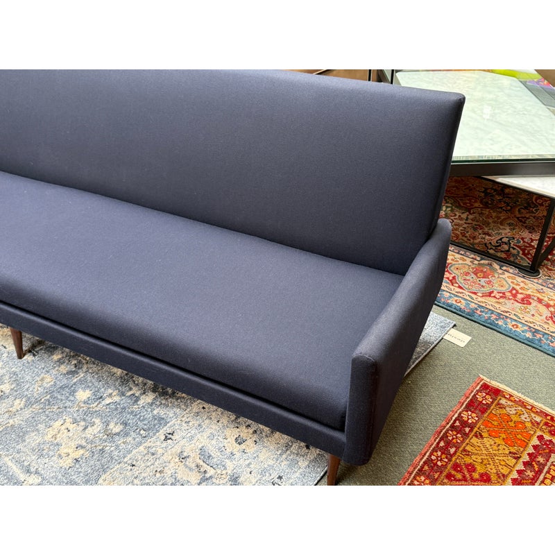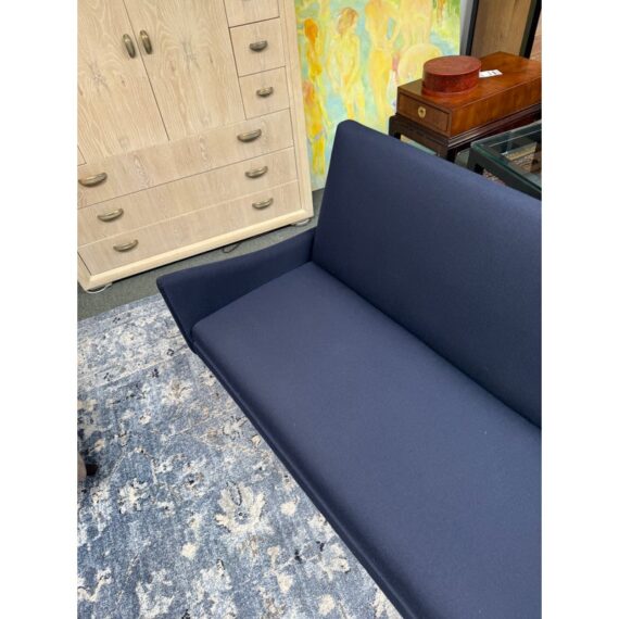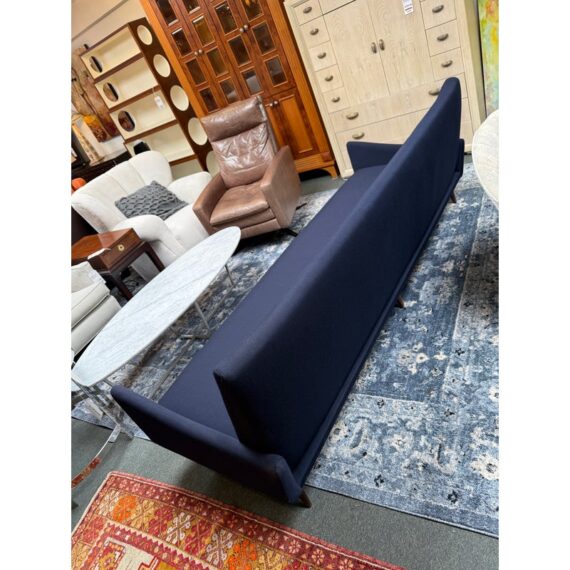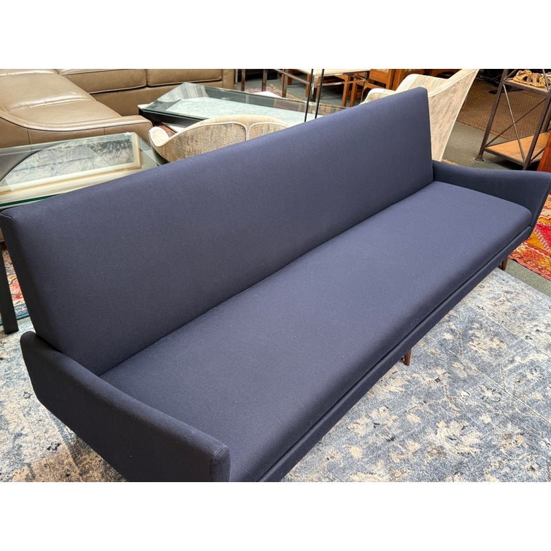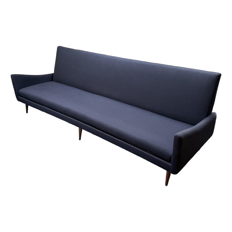 Design Plus Gallery presents a 1960 Custom 801 Sofa by Jorge Zalszupin for L’Atelier, San Paolo. Completely restored in 2016, the elegant low-slung sofa wrapped in rich, navy wool and elevated on tapered wood legs. A sleek foam padded bench seat keeps the lines clean and the seat firm. Small snags and one small hole on cushion covering, condition is consistent with age and use. Made in Brazil.