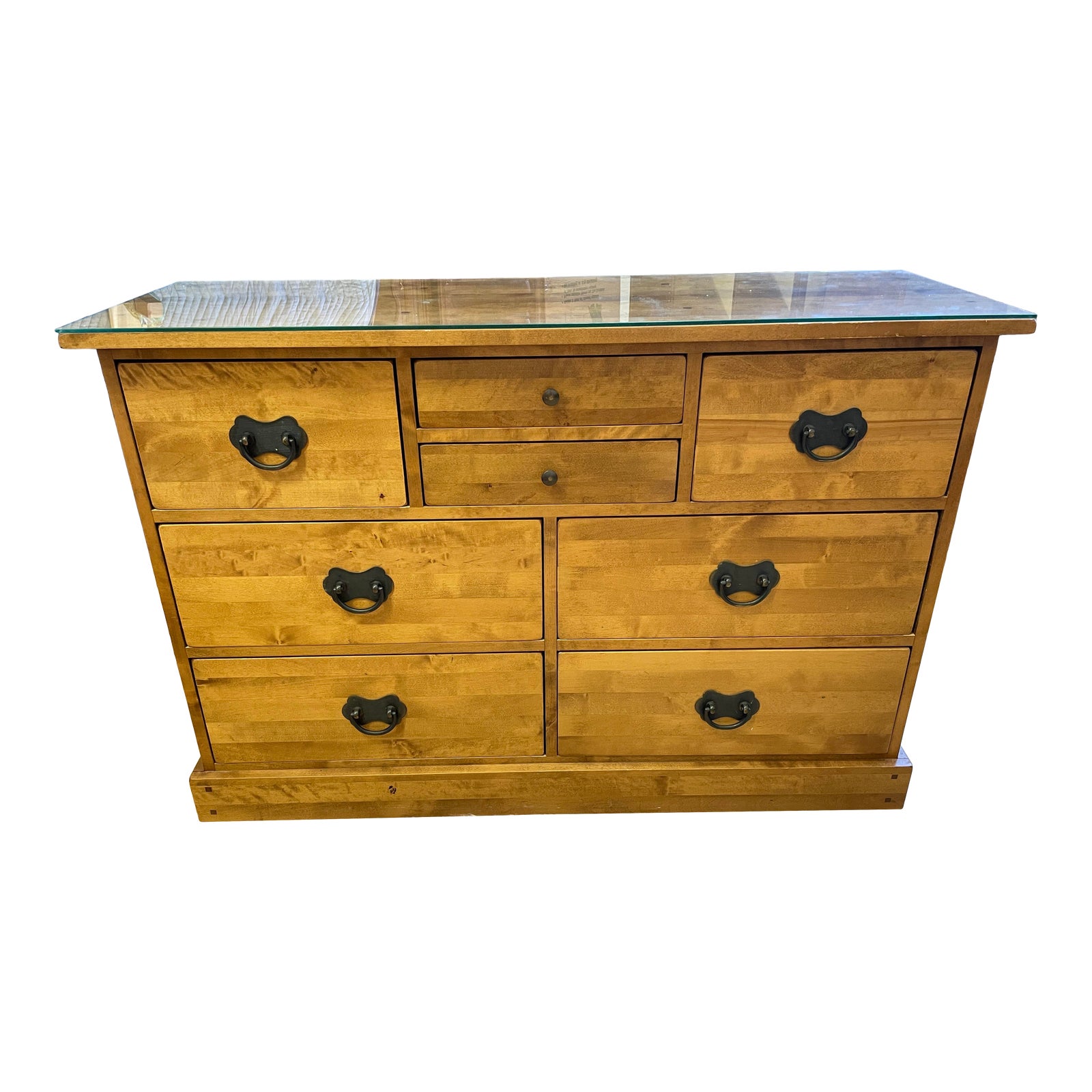 Design Plus Gallery presents a Garrat Eight Drawer Dresser by Laura Ashley. From the Garret Collection. Crafted from solid birch and stained to show the natural look of real wood. It is designed to suit the decor style of any home. Top surfaces are intentionally given rippled and uneven surfaces, which will vary from piece to piece. A custom cut glass was made to protect the dresser surface. Hand finished, lacquered and include beautiful natural wood features such as knots, grain and color variation etc, which differ from parts of the same product to make each piece unique. The finish is Honey. The hardware drawer pulls are iron. Minor wear form usage.