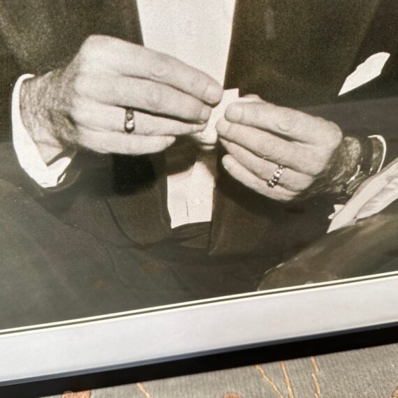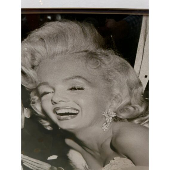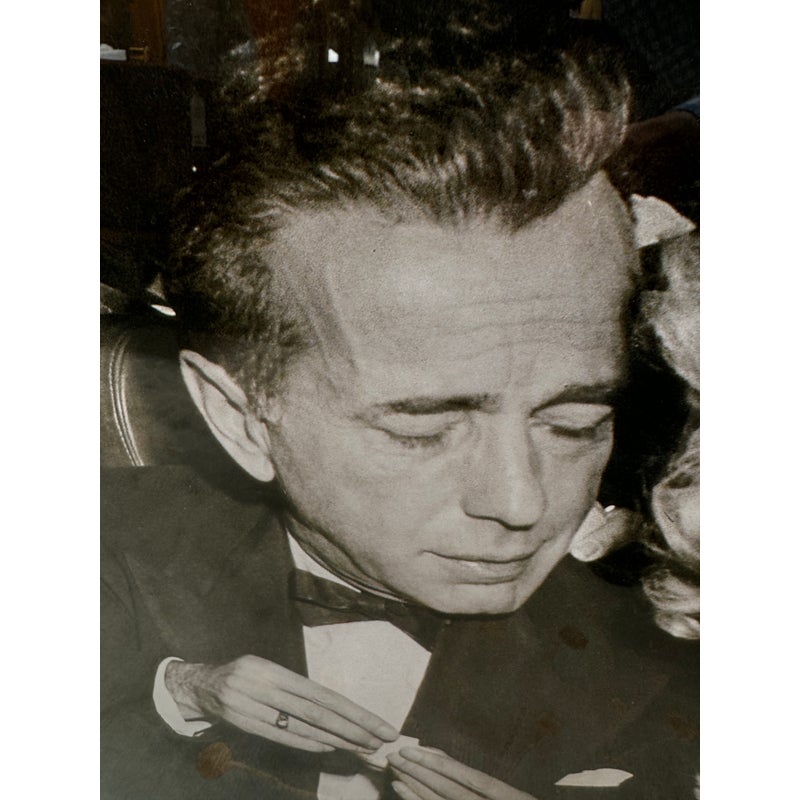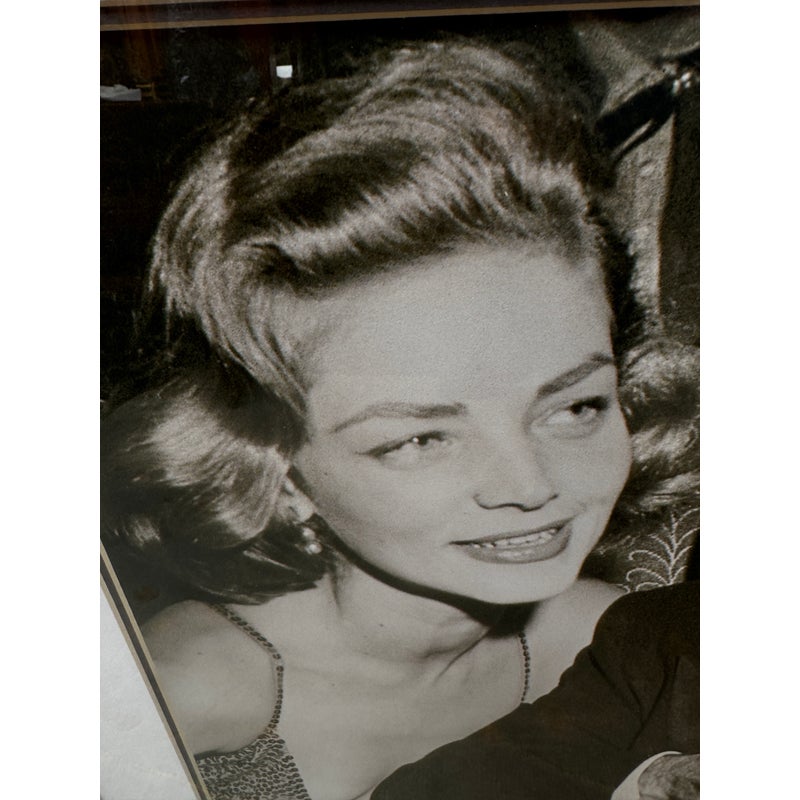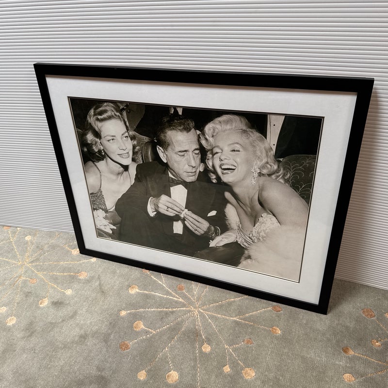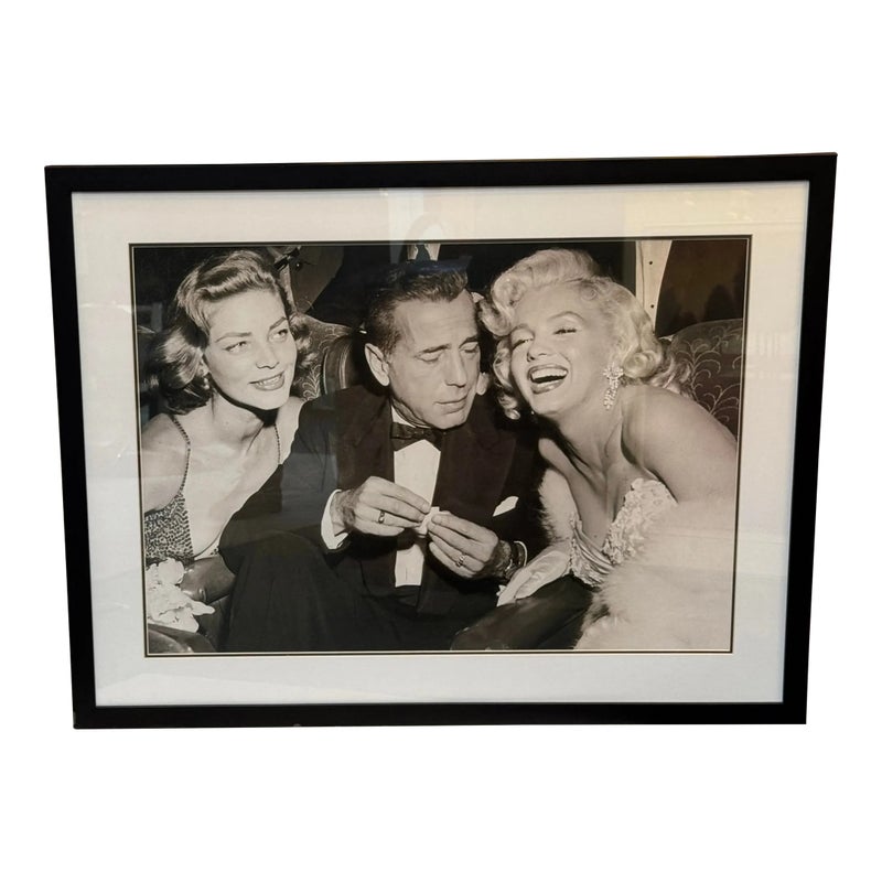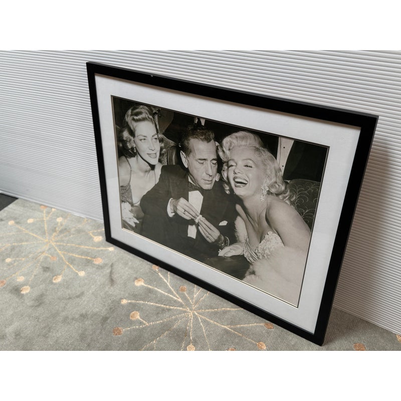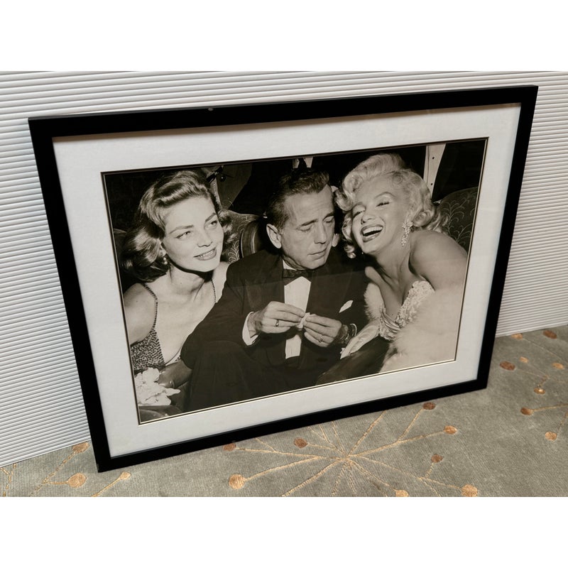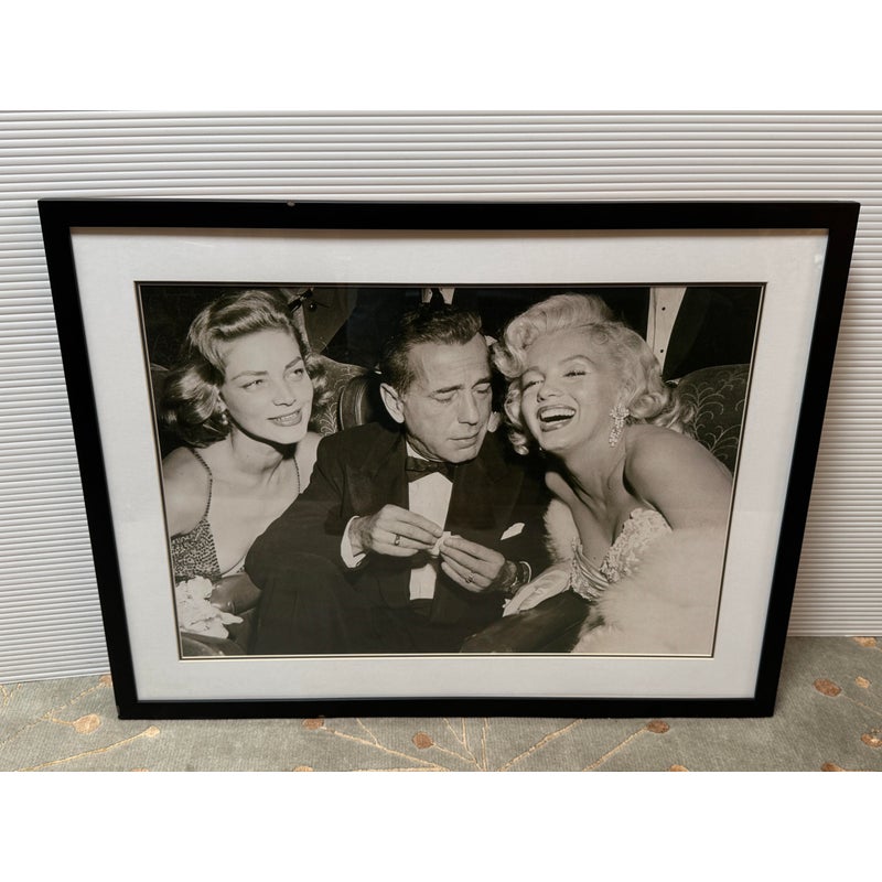 Design Plus Gallery presents a Lauren Bacall + Humphrey Bogart + Marilyn Monroe Framed Print. Custom framed and matted black and white image print. In good condition, minimal wear.