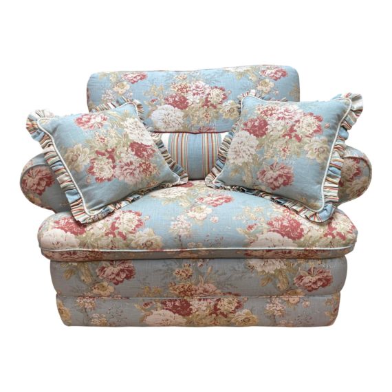 Design Plus Gallery presents a Shabby Chic Recliner Arm Chair. Charming linen fabric has floral patterns in a sky blue, rose and cream palette. Lines are finished softly with a cable welt. Generous seat comes with three decorative pillows with complementary striped fabric. Lift located on the profile reclines into seat and back into relaxation. There is light wear on some of the fabric, but the movement of the pattern makes it hard to notice.
