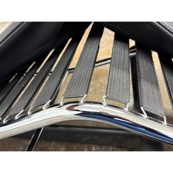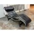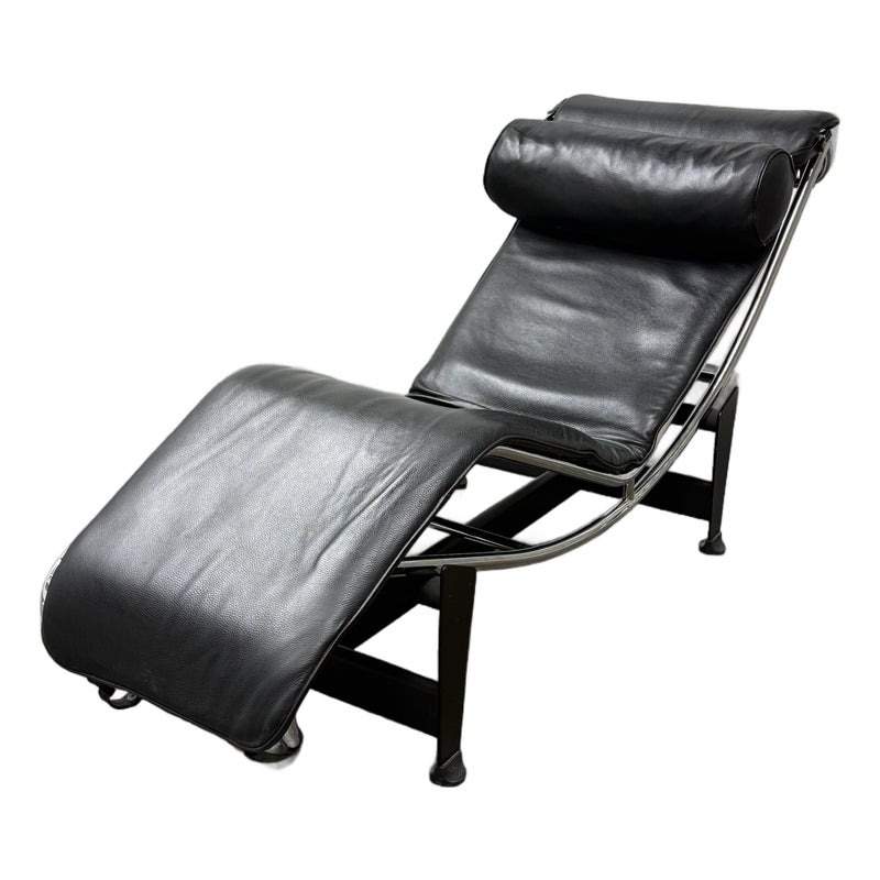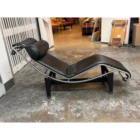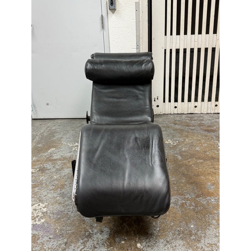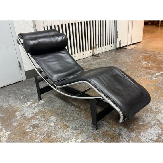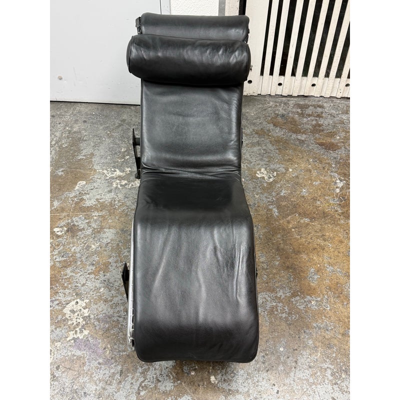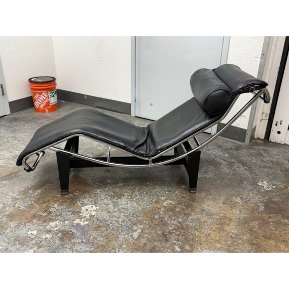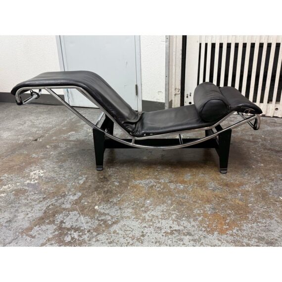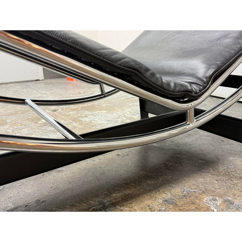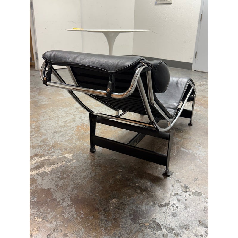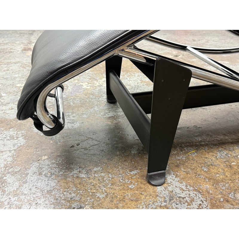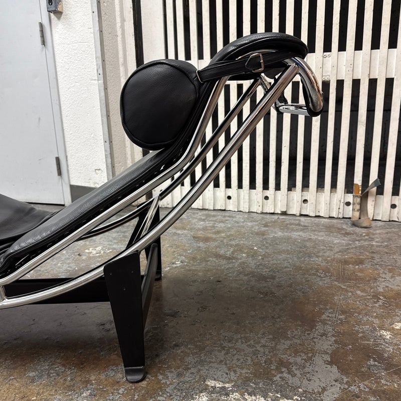 Design Plus Gallery presents a Le Corbusier Style LC4 Chaise Lounge. This style of chaise was originally designed by Charlotte Perriand, Pierre Jeanneret & Le Corbusier in 1928 and is still considered a timeless expression of modernist design. The signature “floating” polished chrome frame cradles the body and adjusts effortlessly to its contours providing you with an inviting, supportive resting position. Upholstered in a black leather, the lounge exudes luxury while maintaining a minimalist allure. In good condition, visible and minimal wear from usage.