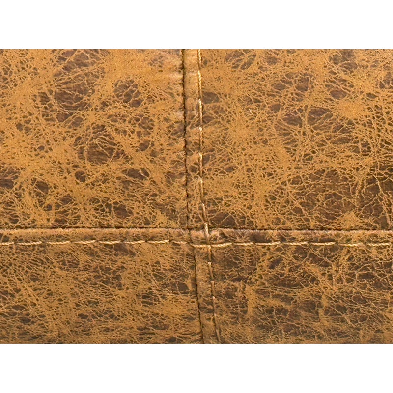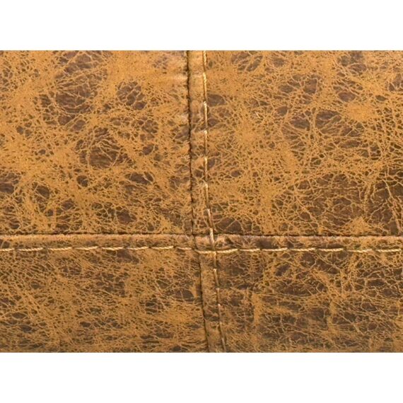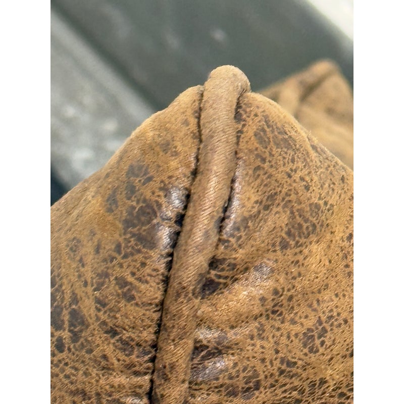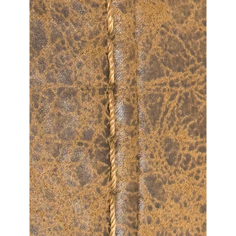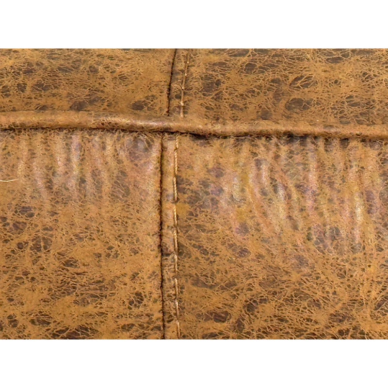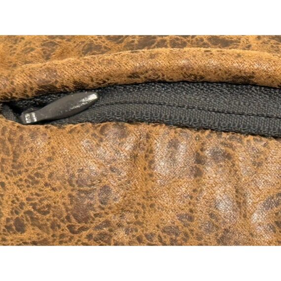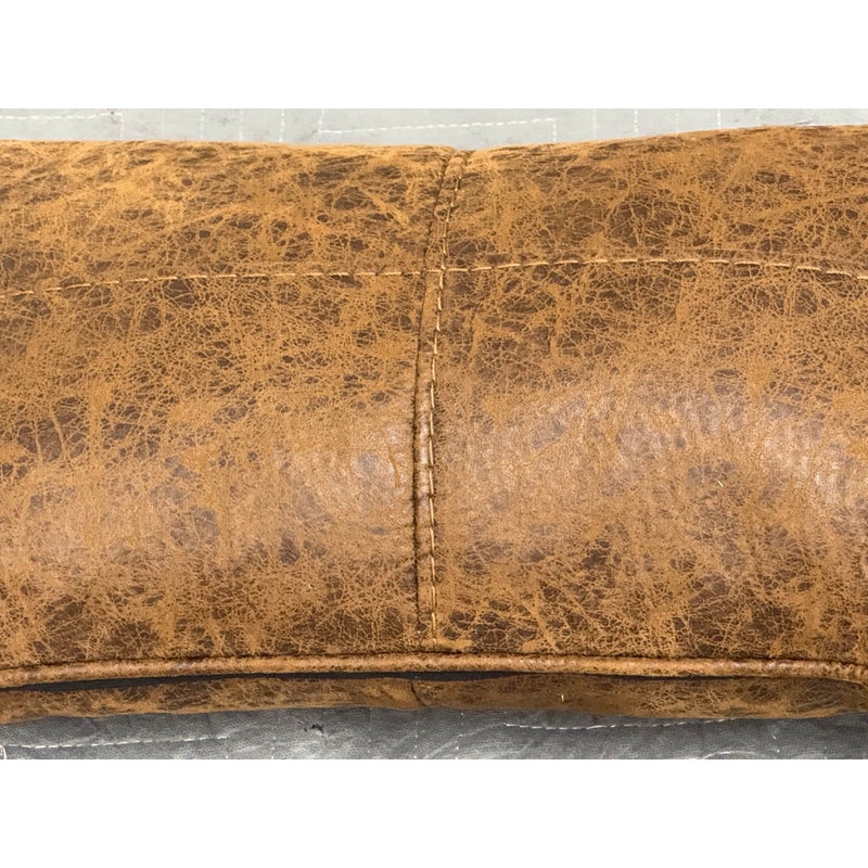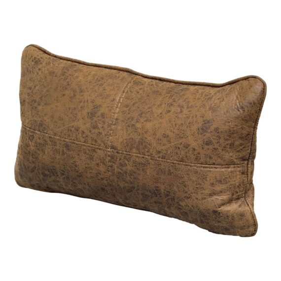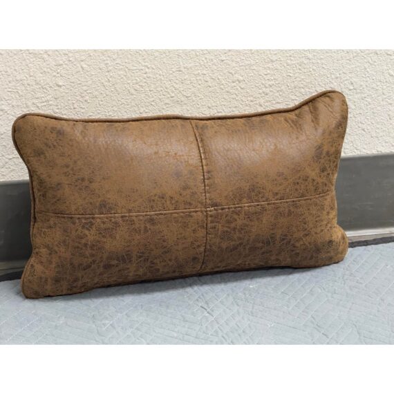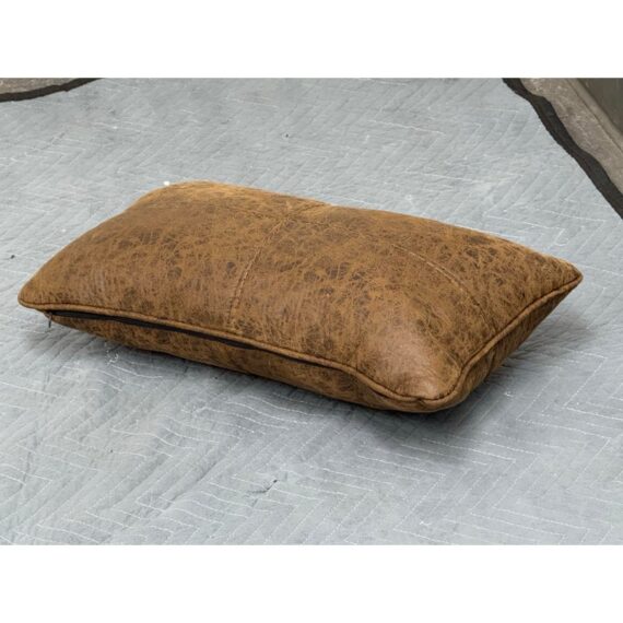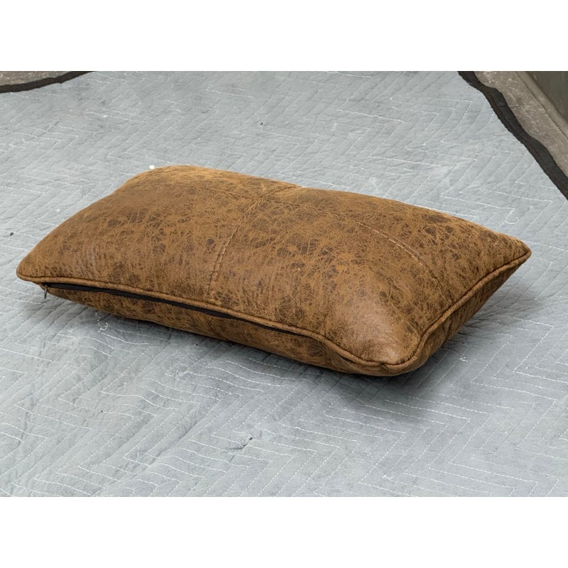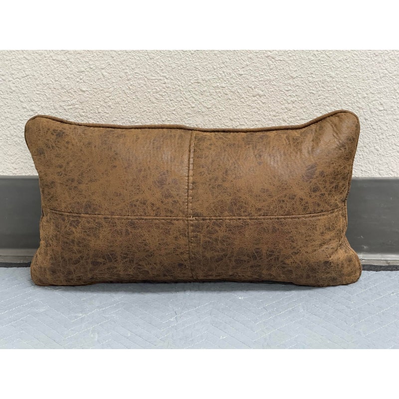 Design Plus Gallery presents a Lumbar Pillow in a Faux Leather Brown Cover. Down insert. This well-stuffed distressed rectangular pillow adds support for your seating and has a mellow vibe. Spruce up your casual decor or simply add flare to a leather piece of furniture. in good condition with minimal wear due to use.