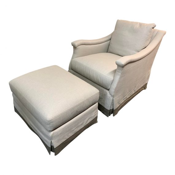 Design Plus Gallery presents a Classic Armchair and Ottoman set, by Lee Industries. Chair No. 3701-01, and its matching ottoman is enveloped in a neutral linen woven upholstery that is embellished with tailored skirt with Taupe band. Comfy loose back and seat cushions are down-wrapped foam. Lee Industries has grown to be a leader and innovator in environmentally friendly manufacturing practices.
