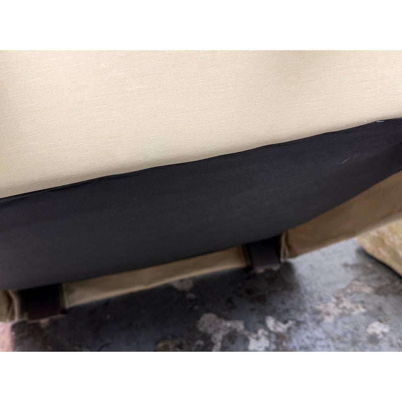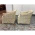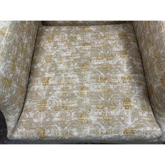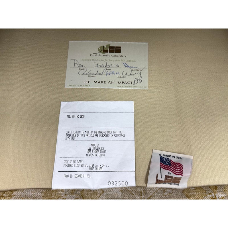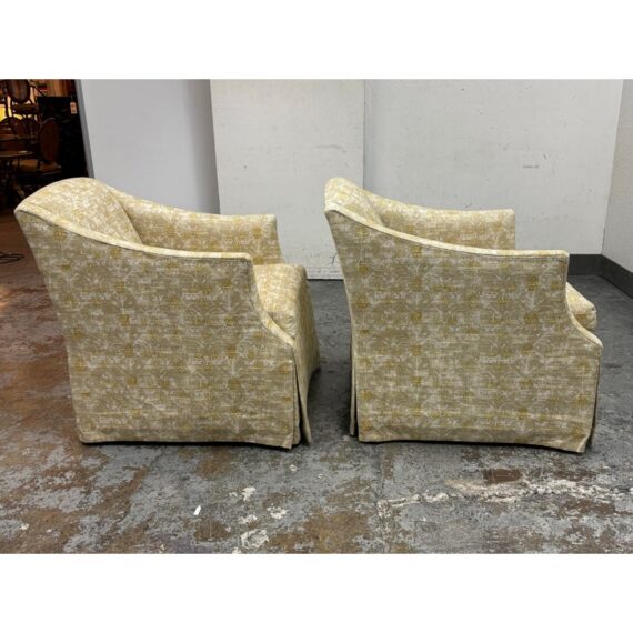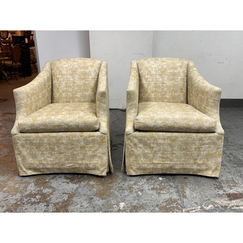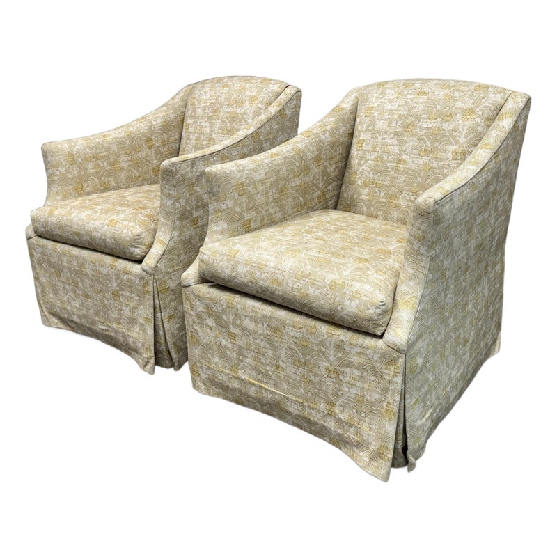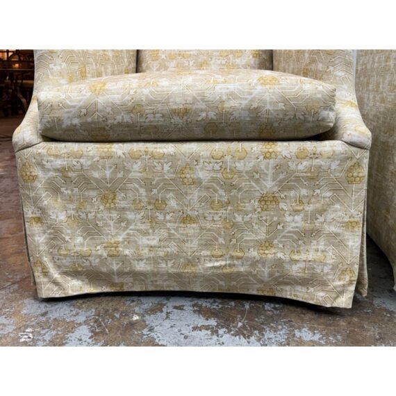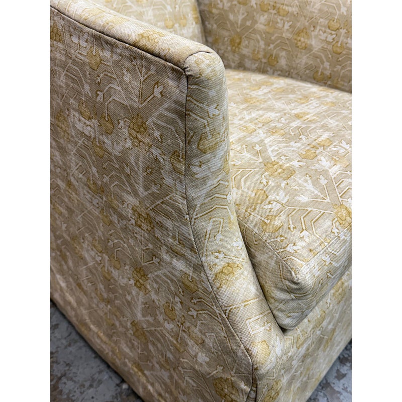Design Plus Gallery presents a Pair of Bespoke Slope Arm Lounge Chairs from Lee Industries. This pair of chairs (Model 1931-01), shows off their tailored silhouette with measured proportions that is associated with the maker. Each armchair has a sloped and sweeping arms, a loose seat cushion, and a skirted swivel base. The upholstery carries an allover botanical and geometric motif in cream, beige, and muted golden tones, giving the pair a quiet layered pattern. They are in good condition with visible and minimal wear from usage. Made in the USA.