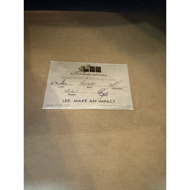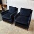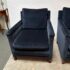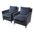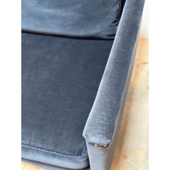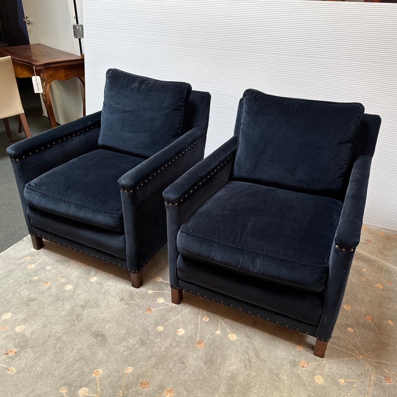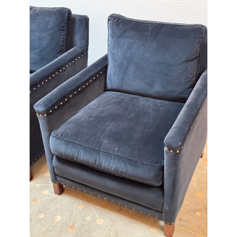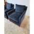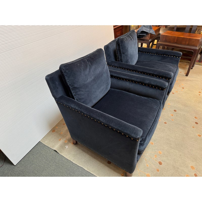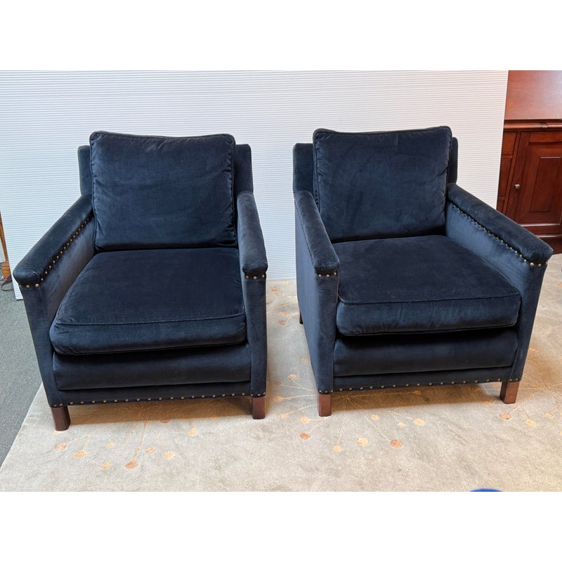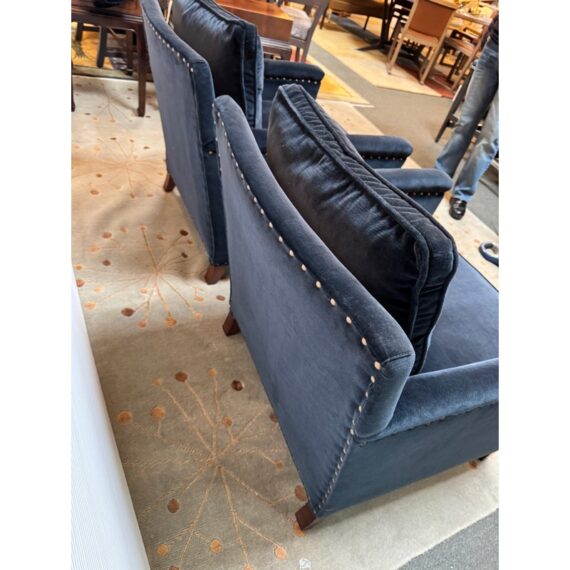 Design Plus Gallery presents a Pair of Velvet Arm Chairs by Lee Industry. Model 1935, perfectly scaled for relaxation or conversation. Rich blue velvet cushions are down and feather filled, detailed with self welting and loose. Dark square wood legs support the elegant pair. Light wear; condition is good for age and use.