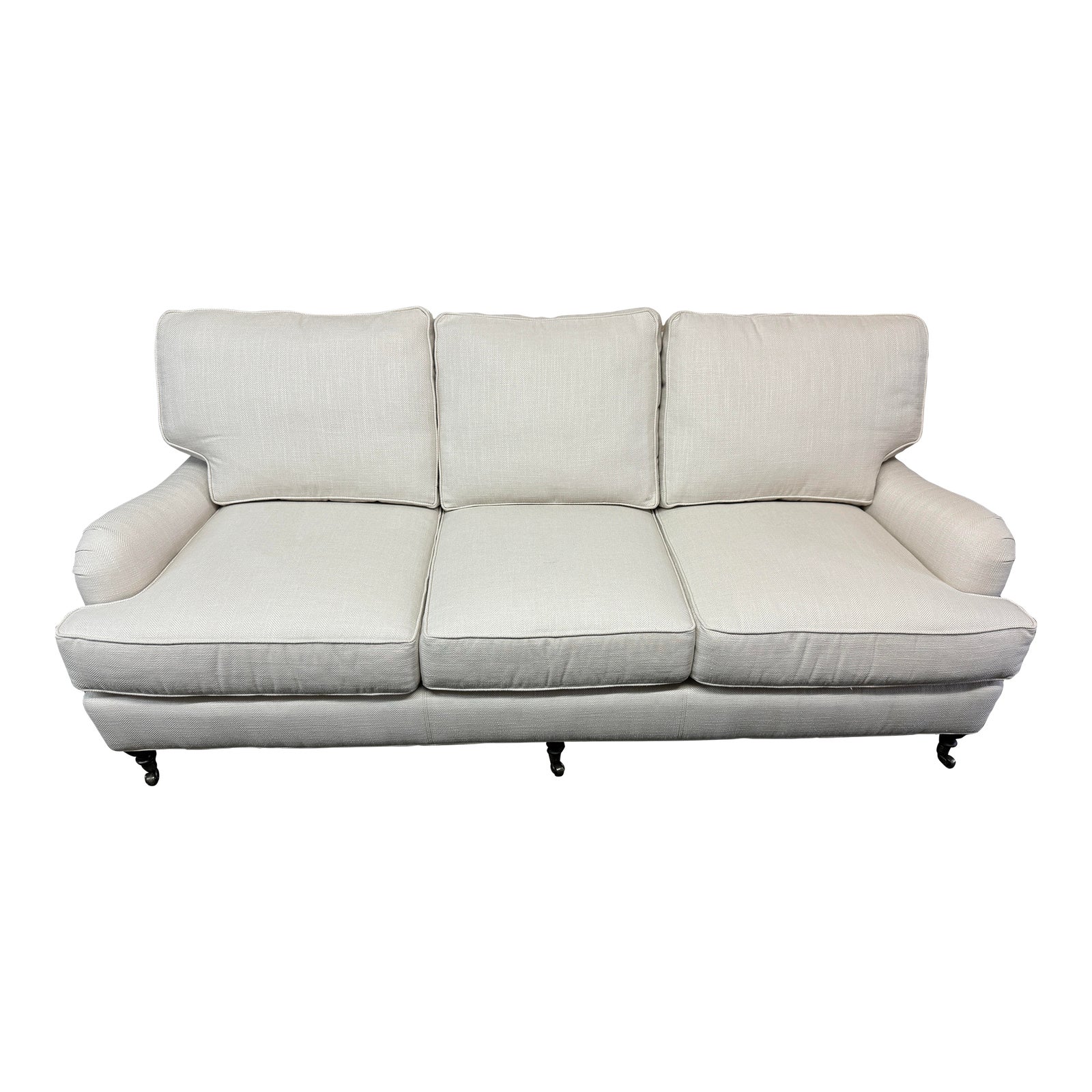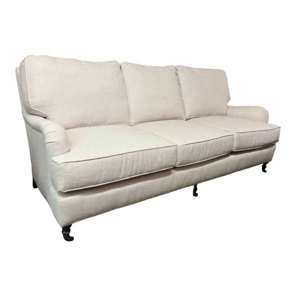 Design Plus Gallery presents a Custom Model #3452 Sofa by Lee Industries. Purchased from Sunrise Home. This custom loveseat features English rolled arms that add a touch of classic elegance to any living space. The loveseat is designed with three loose back cushions that provide comfortable support, and three seating cushions for a cozy seating experience. The loveseat is upholstered in a herringbone off white linen fabric, adding a touch of sophistication and versatility to the piece. The neutral color and subtle pattern of the fabric make it easy to blend with a variety of decor styles. In good condition, visible and minimal wear. Made in USA.