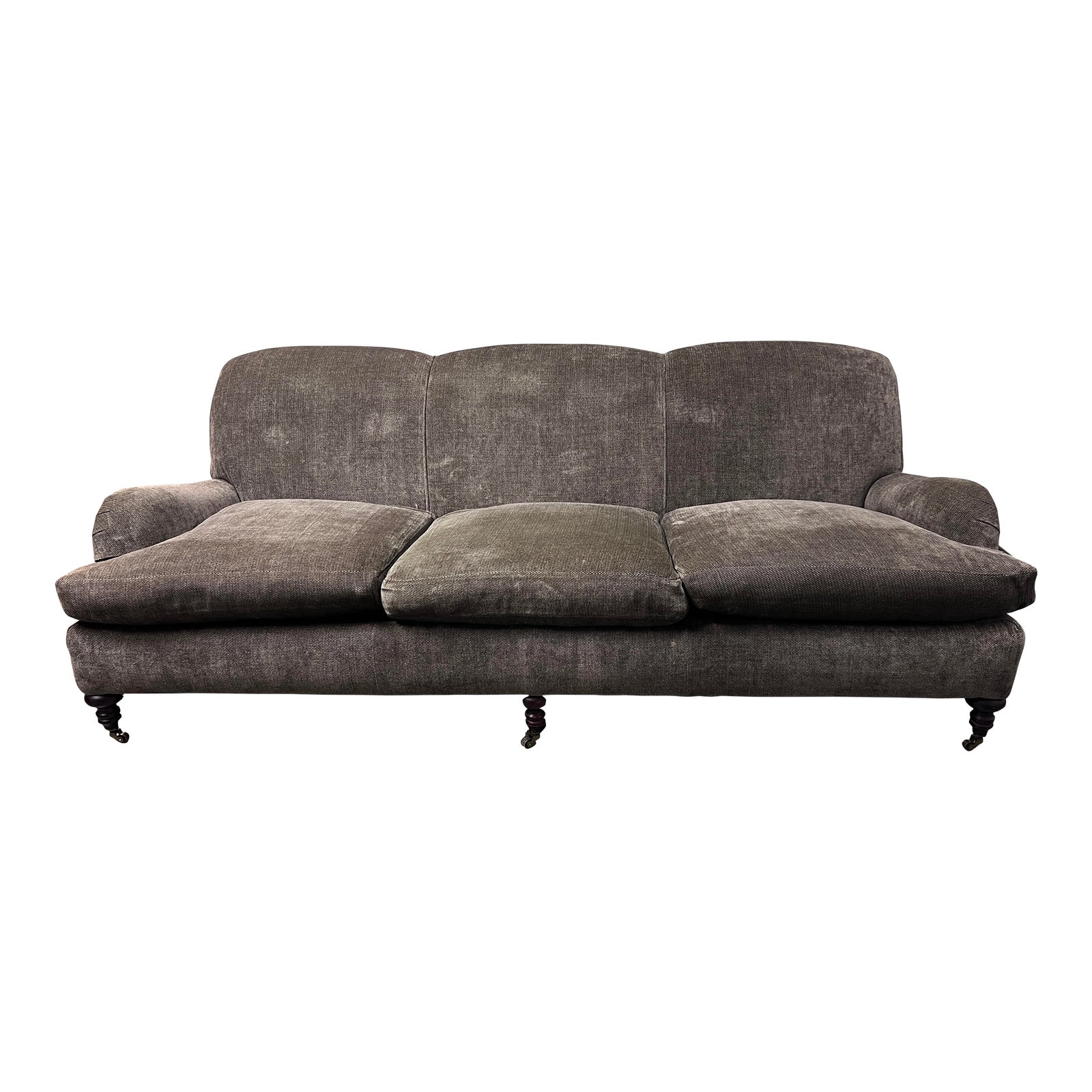 Design Plus Gallery presents a Brown Herringbone Chenille Rolled Arm Sofa from Lee Industries. Model #3266-03 that has been customized with the herringbone fabric. English deep seating, casters on front legs, fixed padded seat back with three loose seat cushions. The seat cushions are feather wrapped. Very comfortable while maintaining an elegant composure. Visible wear from heavy usage + age. Made in USA.