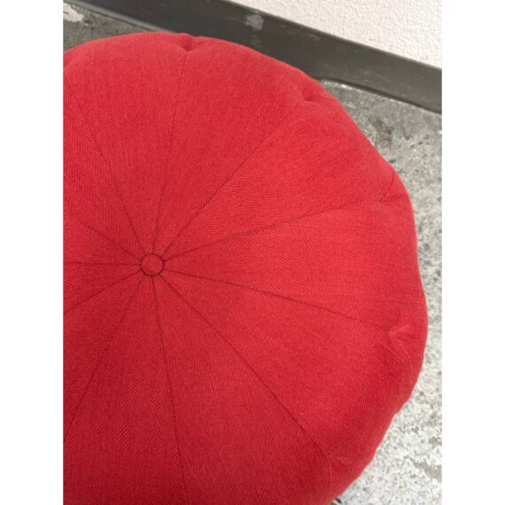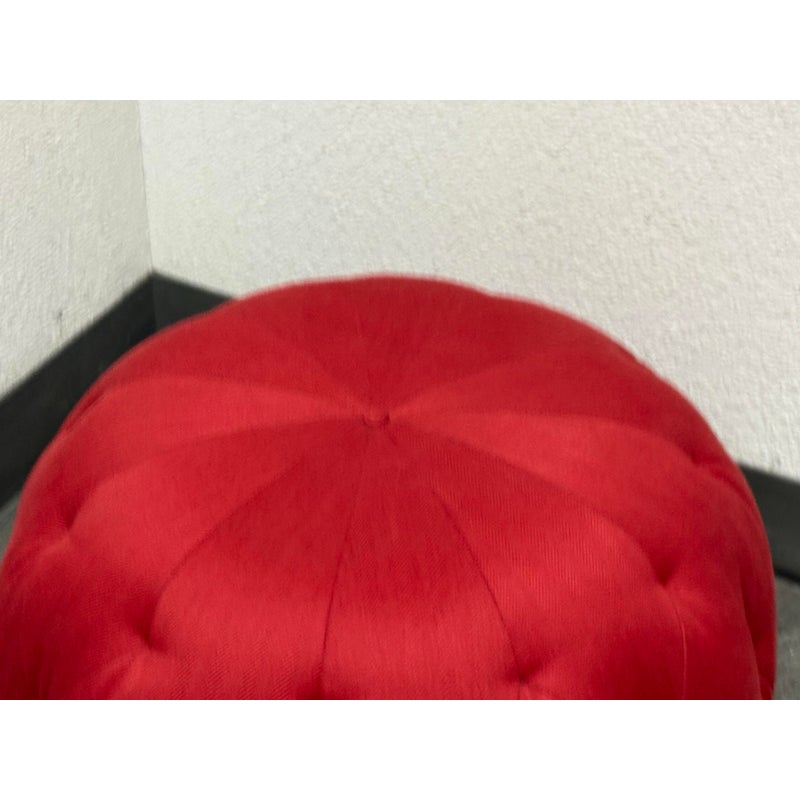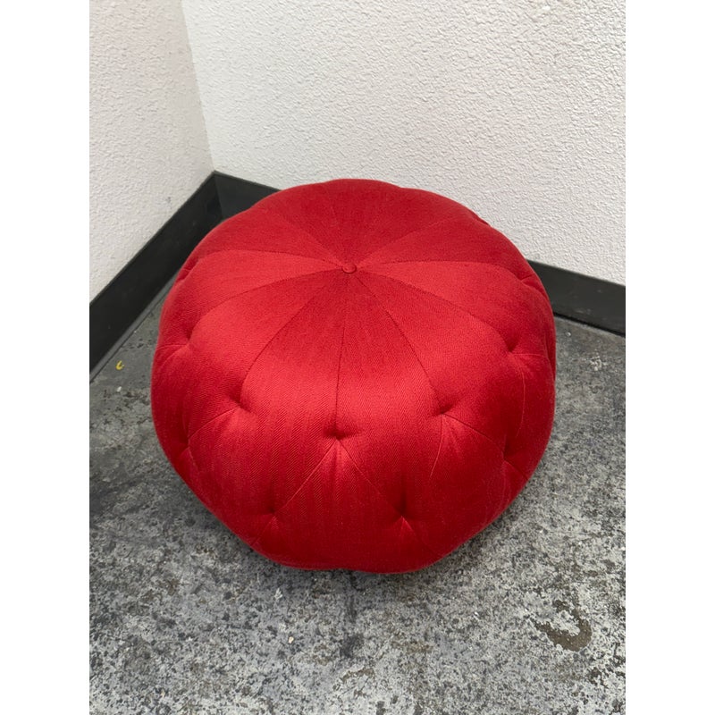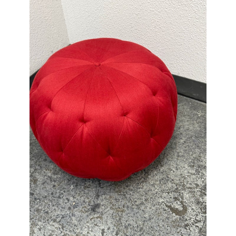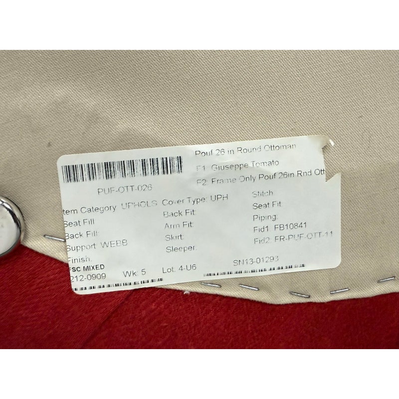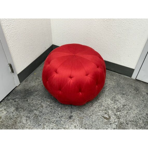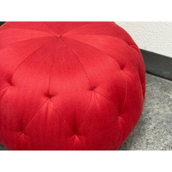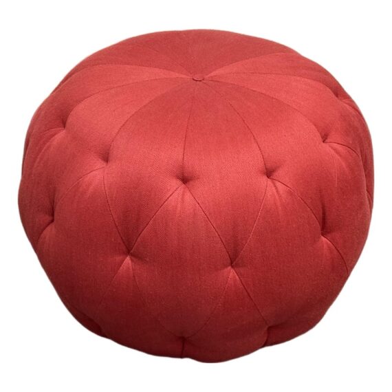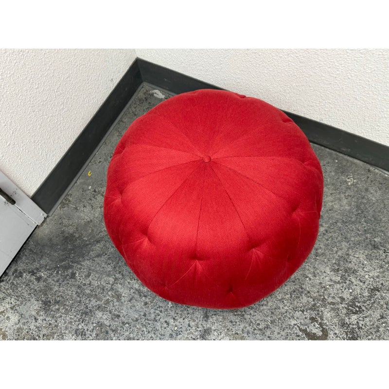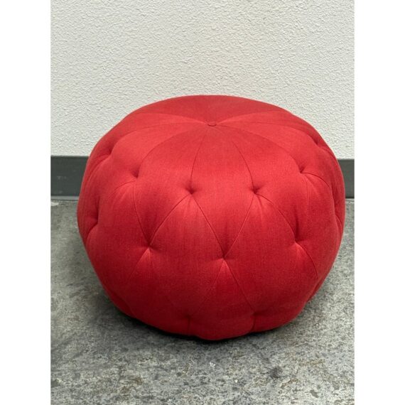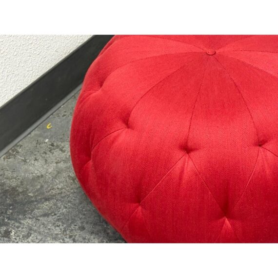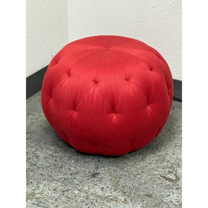 Design Plus Gallery presents a Tufted Ottoman from Lee Industries. The ottoman is in the shape of a popularized pouf, rounded and enwrapped in Giuseppe Tomato Fabric. The structure beneath the fabric is durable, constructed of wood yet gives the illusion of softness. Well made and desirable, custom created to order. It is in good condition with minimal signs of visible wear for its usage.