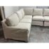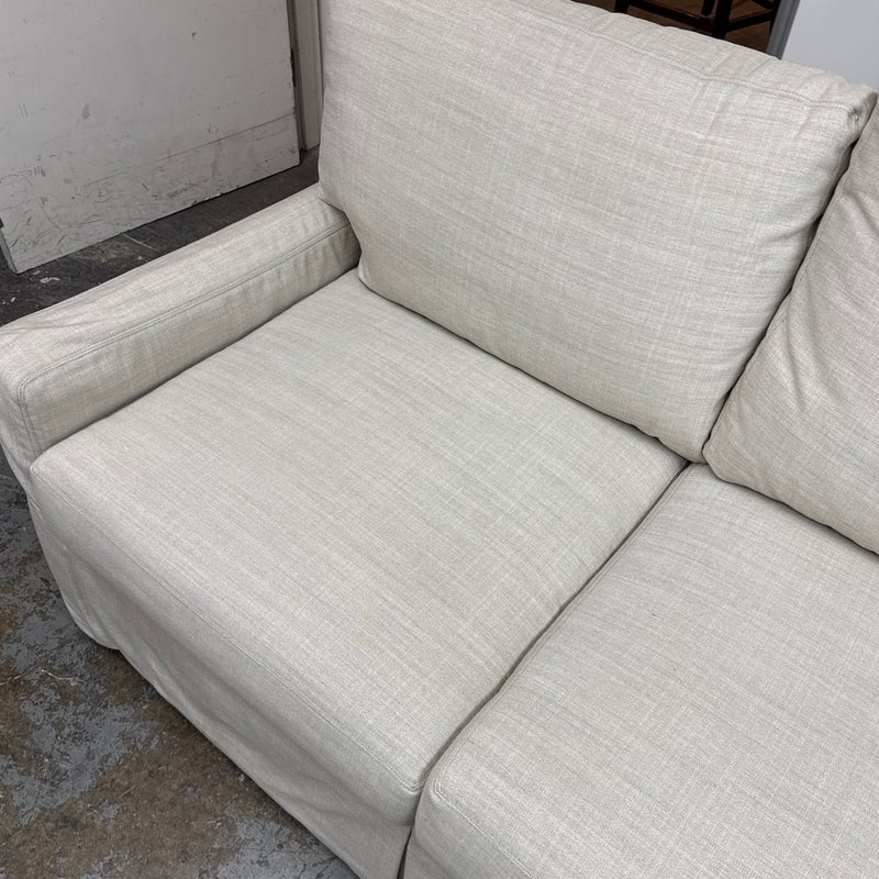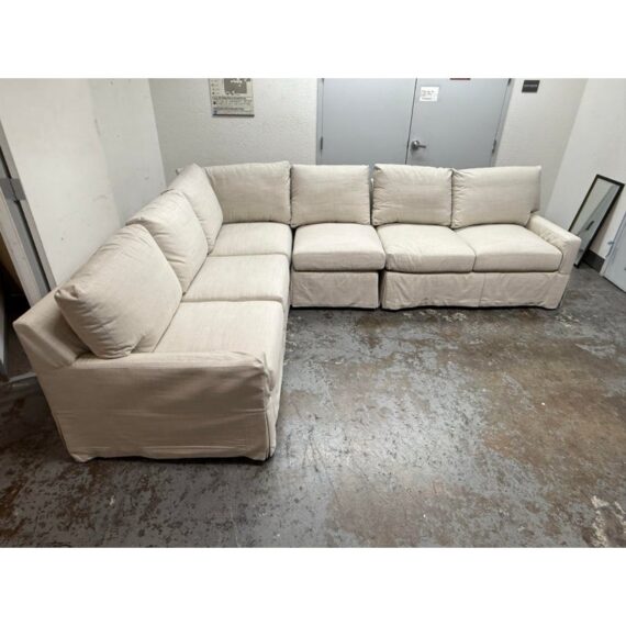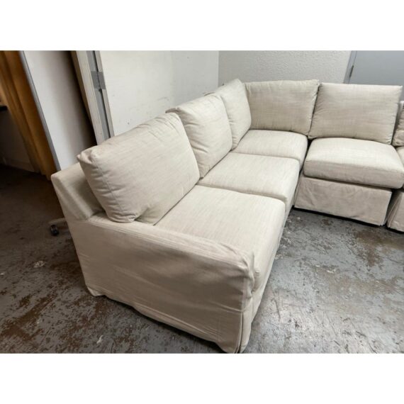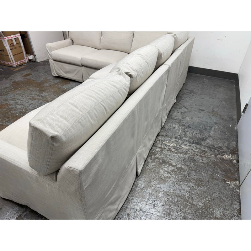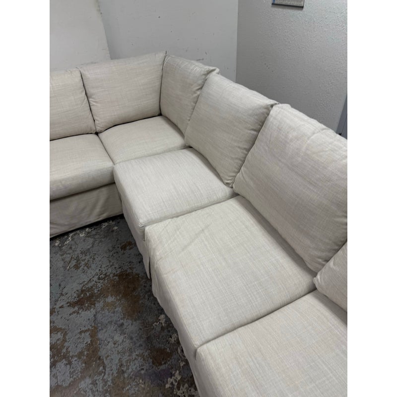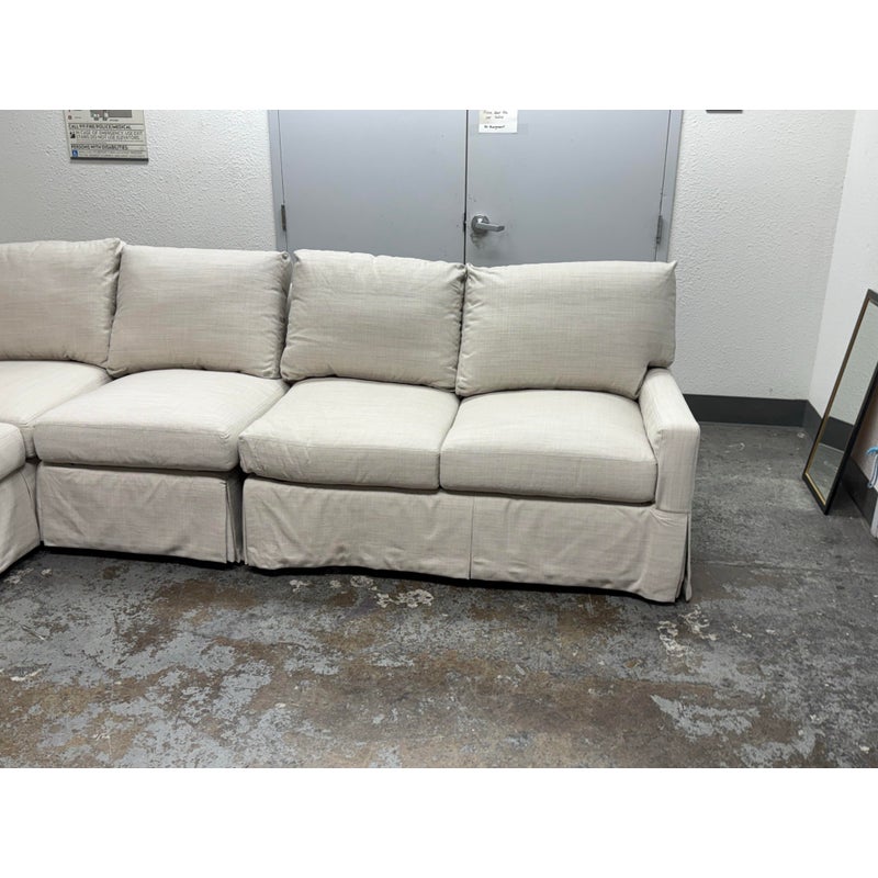 Design Plus Gallery presents the Coverall Sectional from Lee Industries. This beachy, coastal and transitional sectional is slipcovered with a linen wrap off white tone, from Maria Floria Erfoud Collection. The sectional is in three pieces and was style #C5270-3. Its left side shown having two arms, the right having only one arm and one individual armless section that could split off to be its own slipper chair. All seat and back cushions are individual, removable and replaceable. Lee Industries prides itself on handcrafting its furniture in North Carolina, using experienced craftsmen and sustainable practices. The brand emphasizes environmentally-friendly manufacturing processes. The style of sectional has been discontinued by the brand. The sectional is in good condition with minor visible wear that is consistent with minimal usage. Made in the USA.