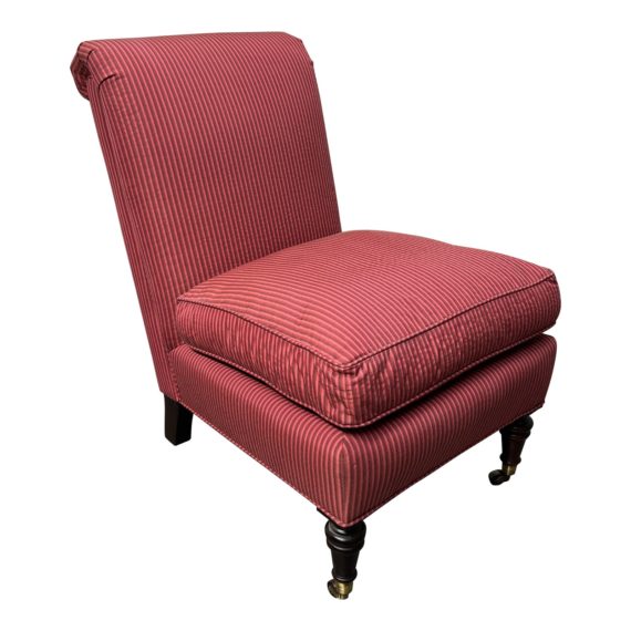 Design nPlus Gallery presents a Wonderfully Textured Slipper Chair from Lee Jofa. This elegant slipper chair by Lee Jofa is upholstered in a burgundy red stripe that is raised with a grosgrain cord. Cushions are down and feather filled. The front legs are turned mahogany on casters, while the rear legs are splayed outwards and also have casters. Armless chair with a simple rolled back. Lee Jofa label underneath.