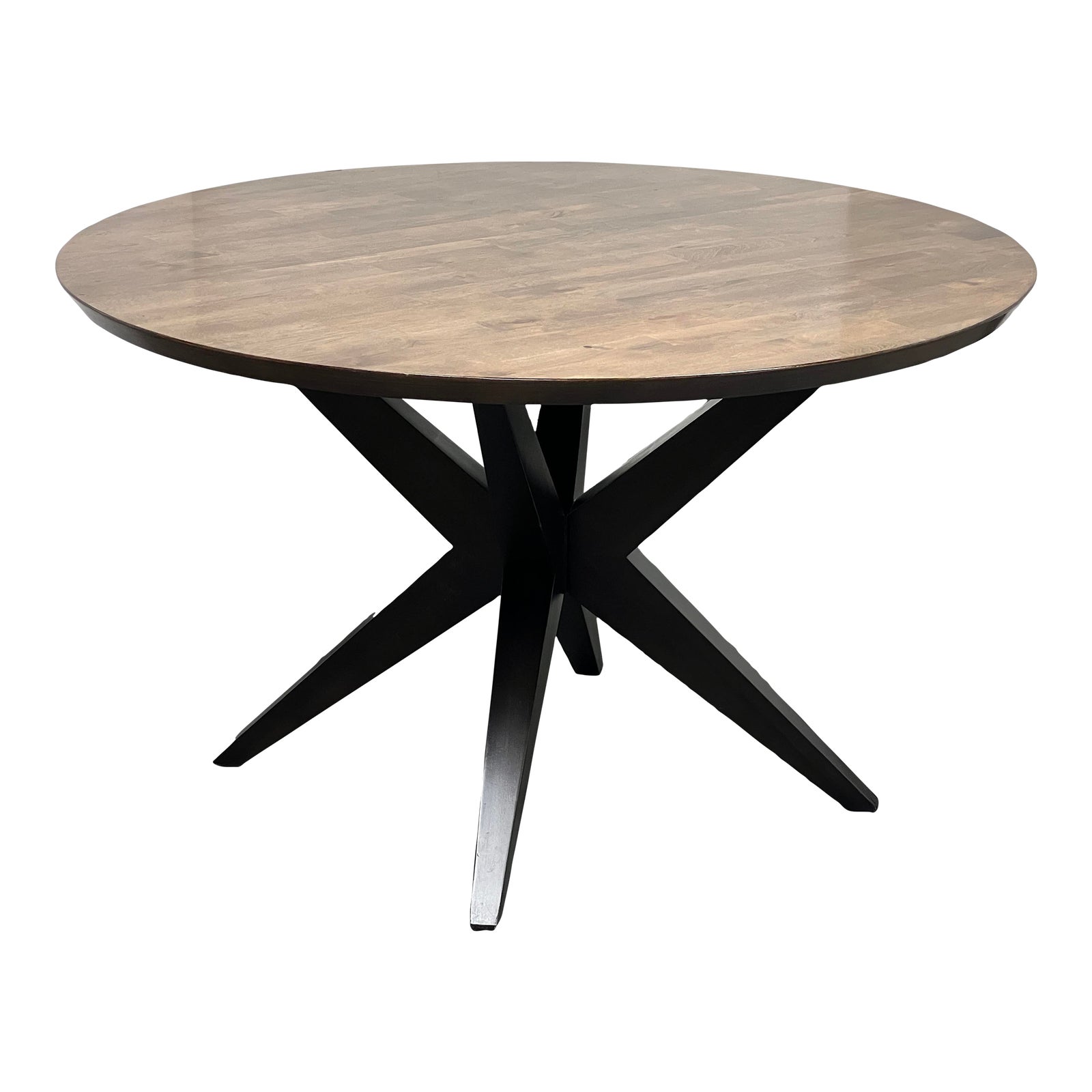 Design Plus Gallery presents a Legacy Furniture Kateri round Pedestal Table. With its starburst-like pedestal base, this stylish round table has a midcentury-modern feel that is great for any eating area. More clean lined than kitsch, however, the tasteful design has an elegant simplicity that is as timeless as the intriguing innovations of the great Isamu Noguchi. Sized just right for four to six people, this beautiful table is perfect for formal and casual dining alike. And the rustic birch veneers in a stunning hazelnut finish with ebony exteriors pairs well with either a contemporary or classic interior. Condition is good with minor wear that is consistent with age and use.