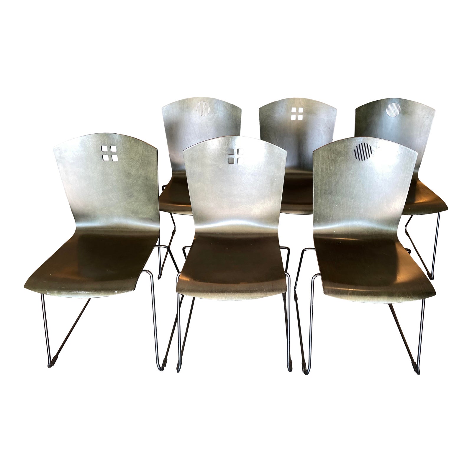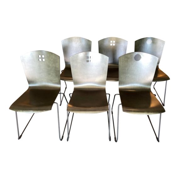 Design Plus Gallery presents a Set of Six Marquette Dining Chairs by Leland International. Designed by Bruce Sienkowski at 2B Studio for Leland, the stacking chairs feature a semi-opaque finished in dark green with a two cut-out designs, supported on black steel rods.