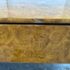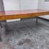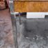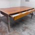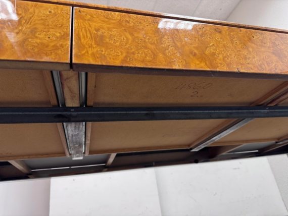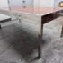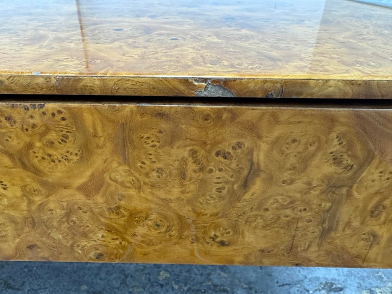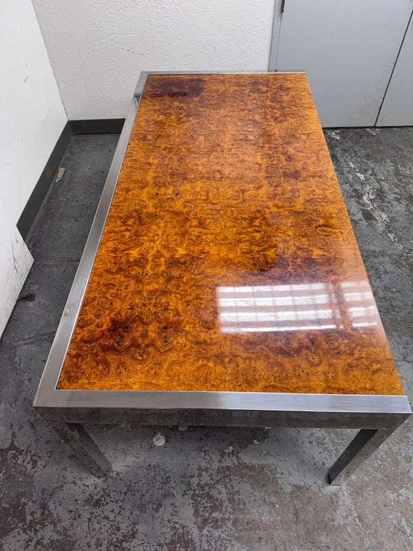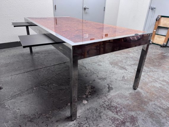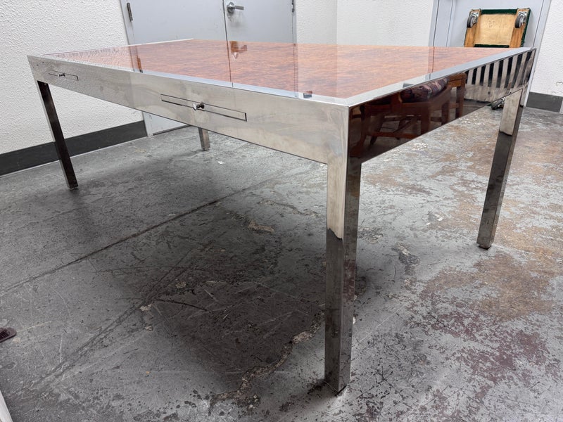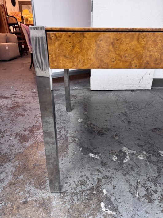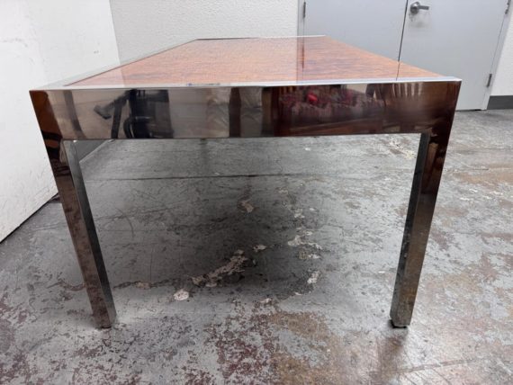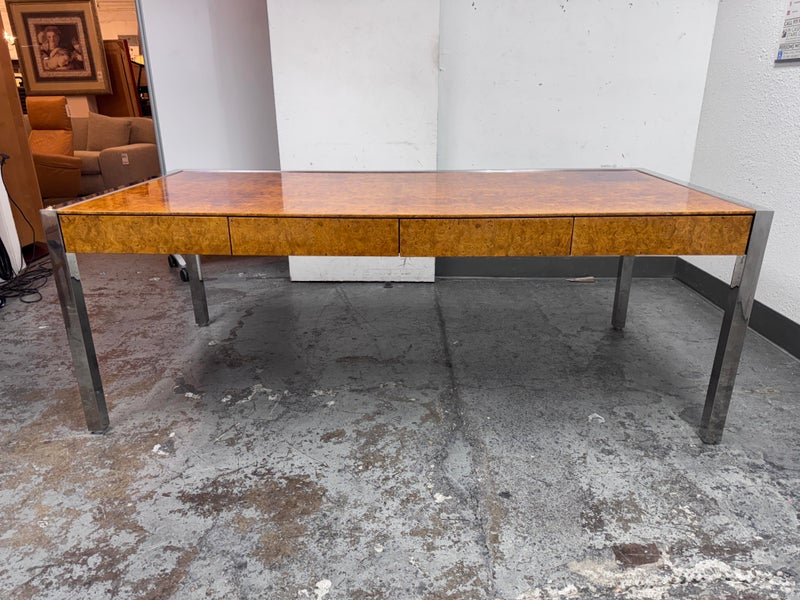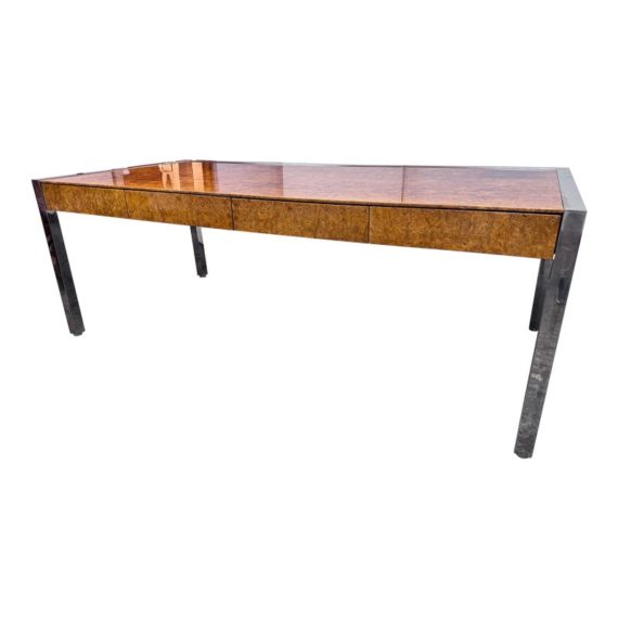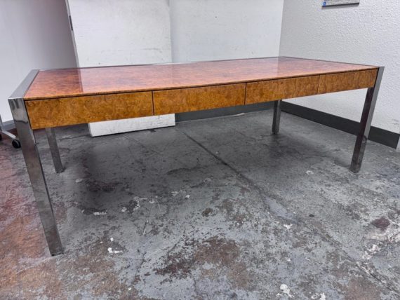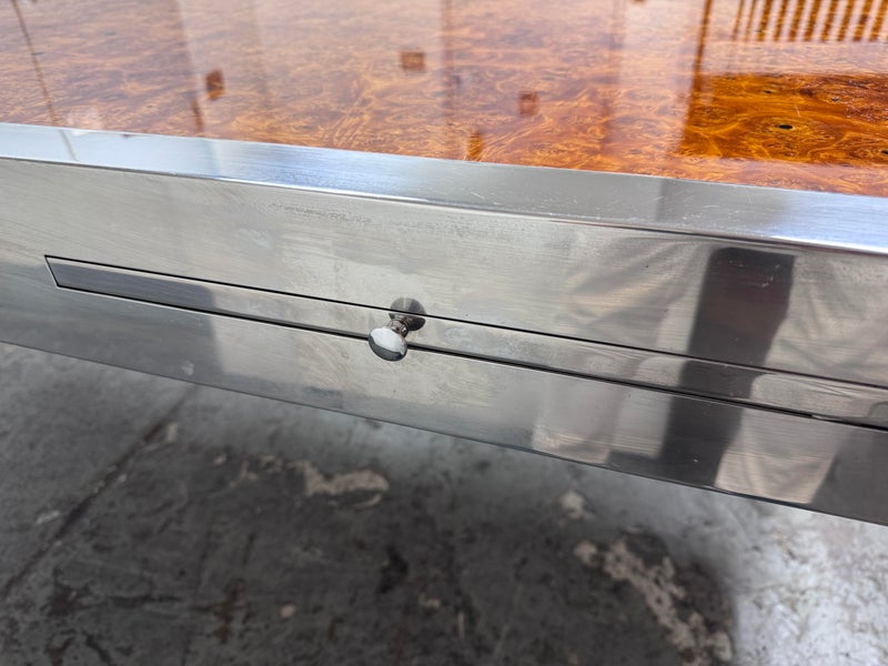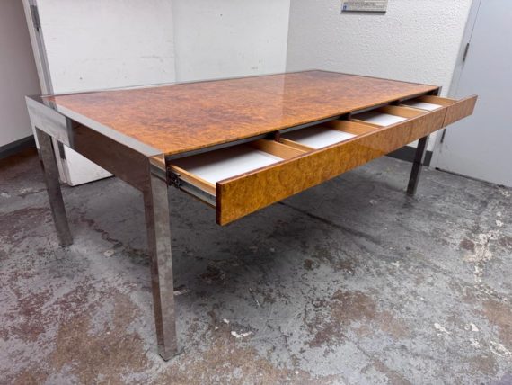 Design Plus Gallery presents an Vintage Executive Desk by Leon Rosen for Pace Collection. Crisply framed in polished stainless steel, the vintage desk oozes success in rich olive wood burl. A few spots of uneven coloring. Three drawers and two pull out shelves. In good vintage condirtion, visible and minor wear, minor fading from usage + age.