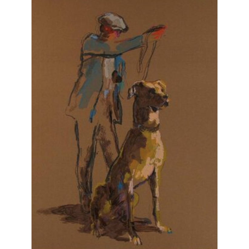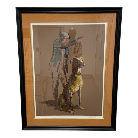 Design Plus Gallery presents a LeRoy Neiman Great Dane Dog Artwork Lithograph 88/375. Reproduction of a gestural watercolor & oil stick of a man with his dog is painted on a umber field. Signed by the artist in the lower right corner in graphite. Matted with gold and a salmon dupioni silk linen blend. Black frame anchors the large scale of the piece and accentuates the light gestural work of the oil stick and line work beautifully. Little evidence of wear, good condition.