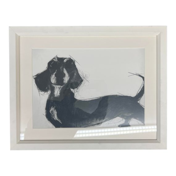 Design Plus Gallery presents a Framed “Les Chiens de Valerie Davide – Chien Saucisse” The Dachshund, a dog belonging to the artist Valerie Davide. This print will add some charm to any interior. A charcoal drawing on white rag watercolour paper. Original purchased from William Stafford on London.