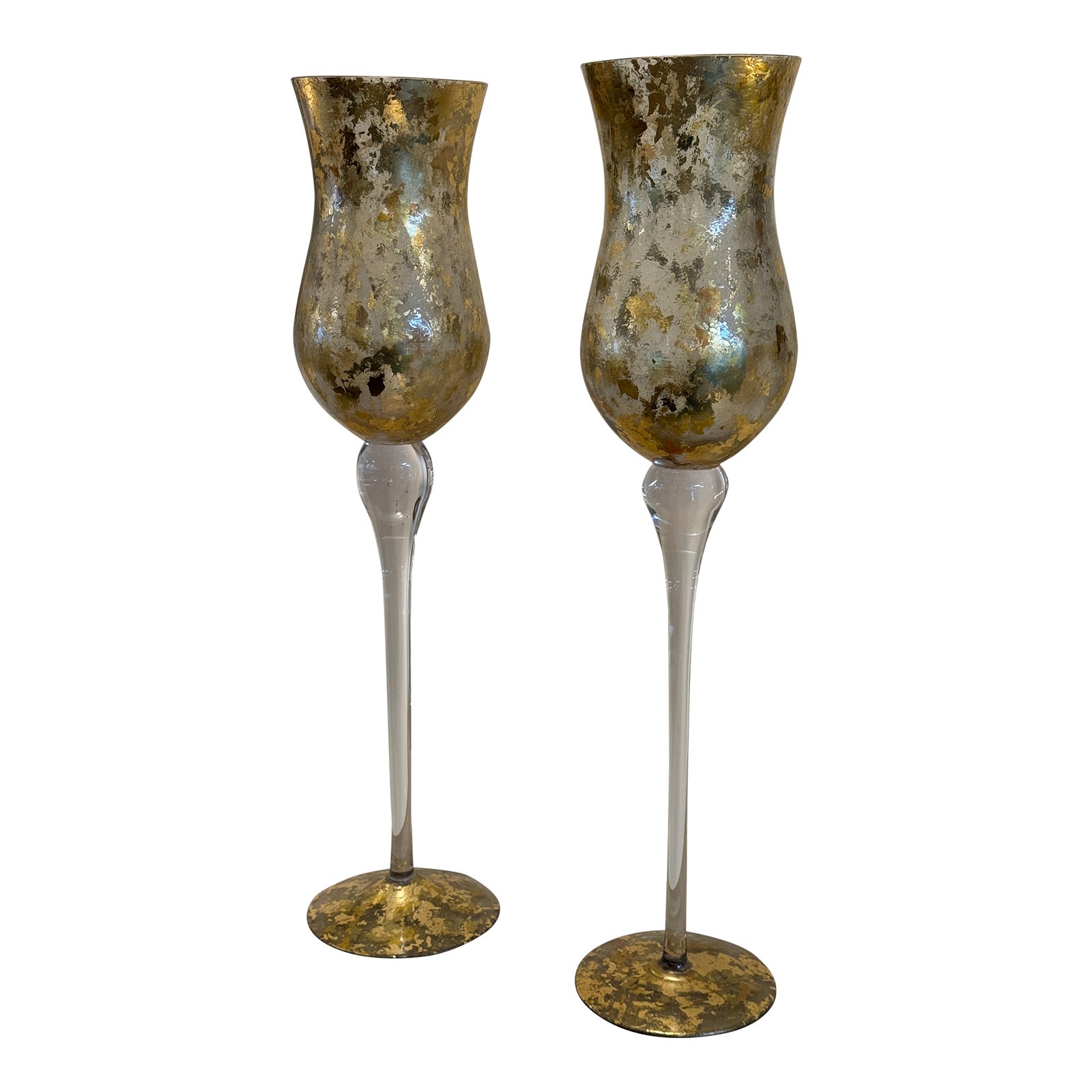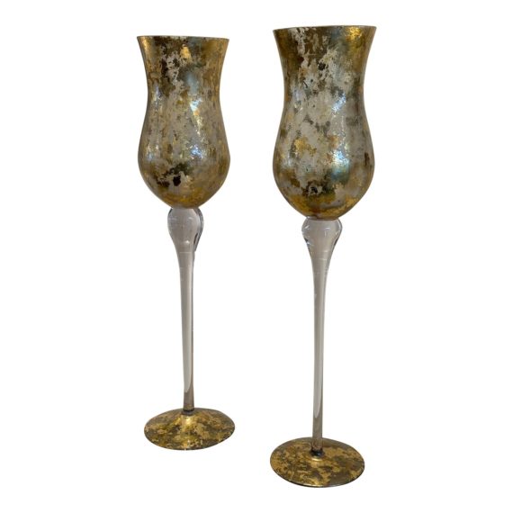 Design Plus Gallery presents a Pair of Gold Leafed Candleholders by Lesley Roy Designs. Gossamer gold leaf details these large, luxurious glass candleholders at top and base. Flickering candlelight will dance and glow. Little evidence of wear; condition is good for age and use.