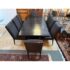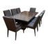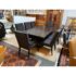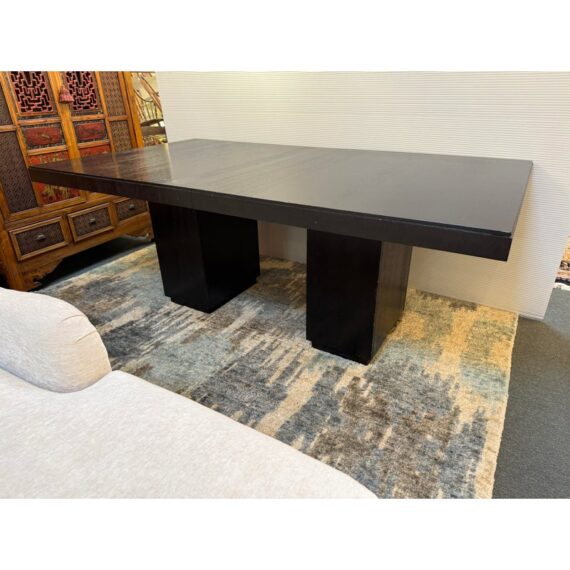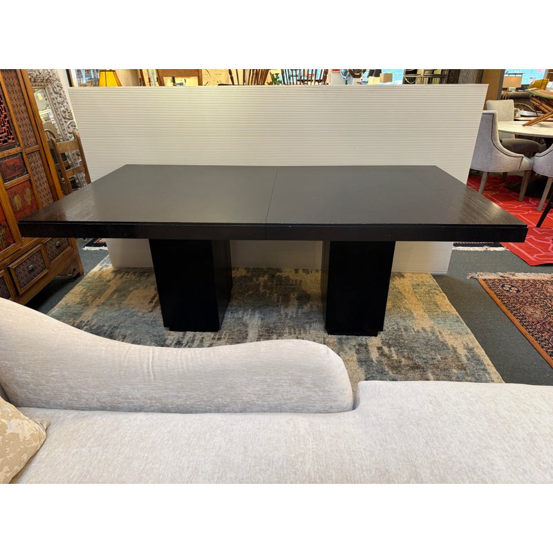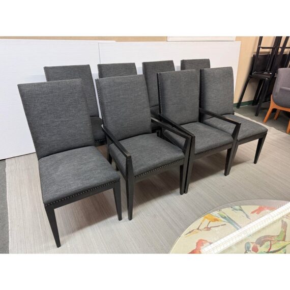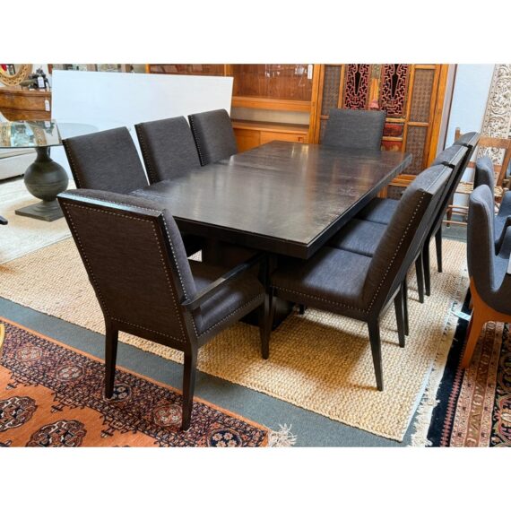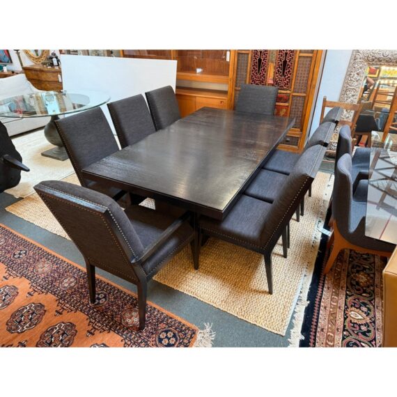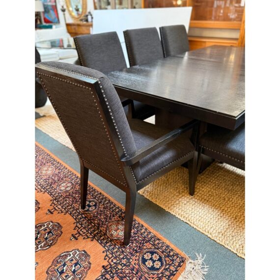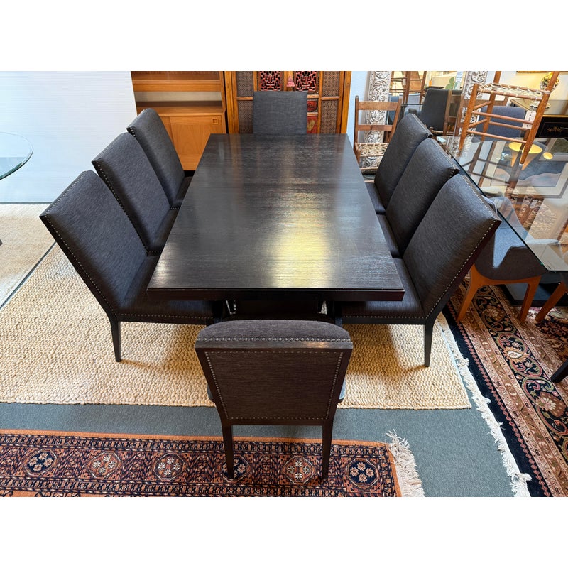 Design Plus Gallery presents the Carrara Modena Dining Table and Set of Eight Vantage Dining Chairs by Lexington Furniture. The Modena dining table has a robust double pedestal base. The minimalistic frame is in a refined Carbon Black stain that accentuates its grain and is the epitome of new contemporary design. The table’s expansive width accommodates can accommodate a part of eight entire dining party when its single leaf is inserted. These chairs have a balanced silhouette with the right amount of embellishment to show off their fine execution in craftsmanship. Their Gray Mist performance fabric consists of a soft linen weave and is tailored with nail head trim on the black wood frame. The set included two arm chairs with six side chairs for a perfect balance in your dining room.Visible wear is present but overall the chairs + table are all in good condition with brand information on their underside.
