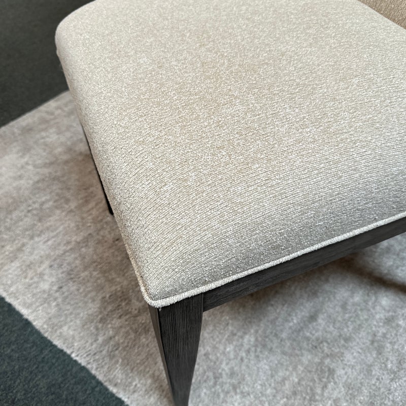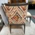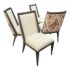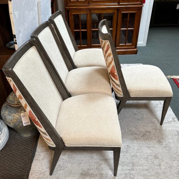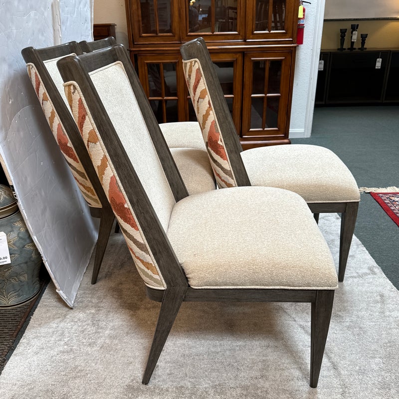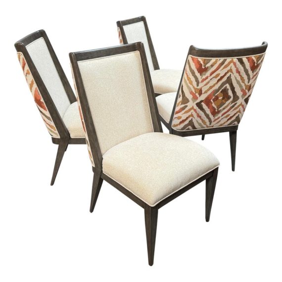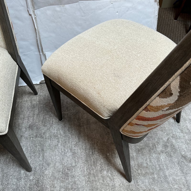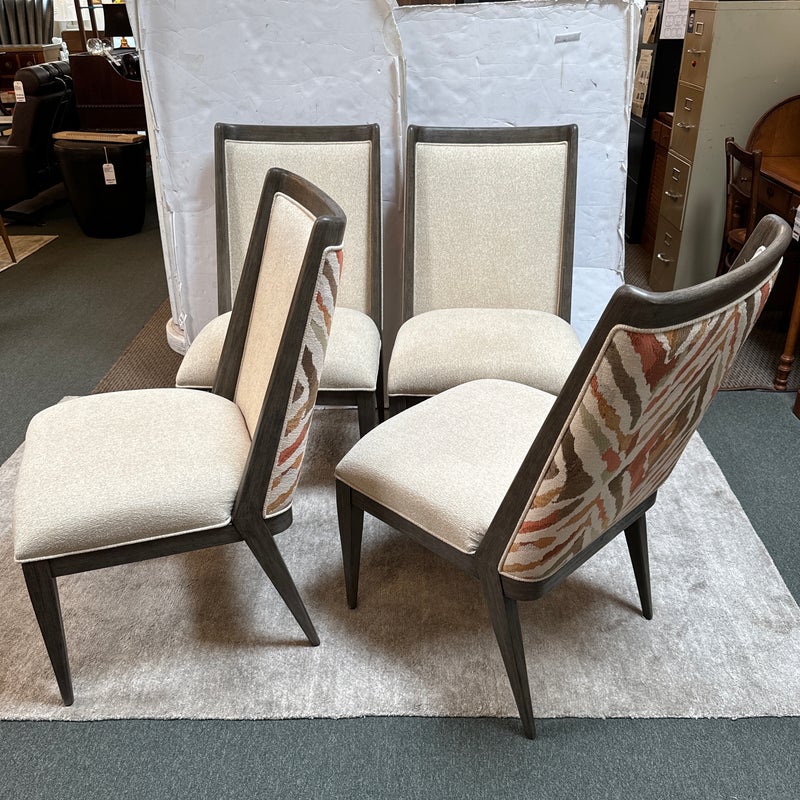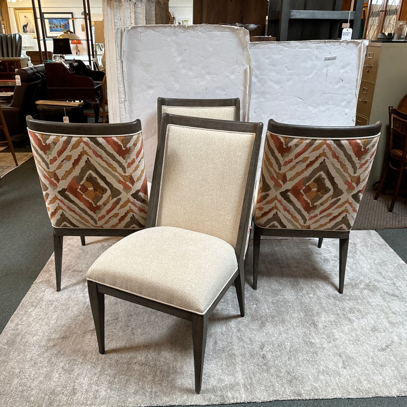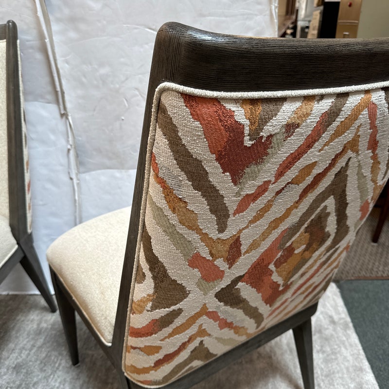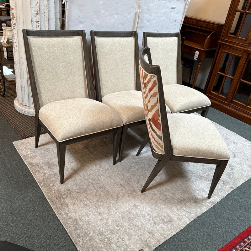 Design Plus Gallery presents a Set of Four Cohesion Haiku Dining Chairs from Artistica Home. Each subtly angled mahogany silhouette has a Grigio wire brushed finish that softly contrasts the natural linen upholstery (business) in the front and complements the warm neutral ikat print (party) in the back. Casual elegance for your dining space. The set is in good condition with minimal signs of wear. Made in the USA.