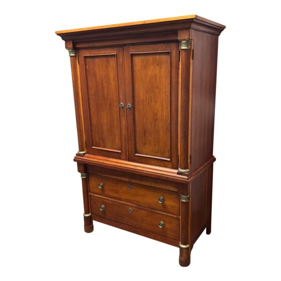 Design Plus Gallery presents a Neoclassical Armoire by Lexington Furniture. Fine dark cherrywood is just the start to this elegant collection of well made furnishings. A pillar like design with gold accents in its front. Four drawers, with pairs with equal dimensions. The top two drawers are in the inside of the cabinet and easily pull out to house intimate items. The remaining two lower one having antique brass pulls. Inner cabinet has a shelf to divide interior space with shelving. The cut out on the back was for large television. Backing is missing. Is in good condition for its age + usage. Made in United States.