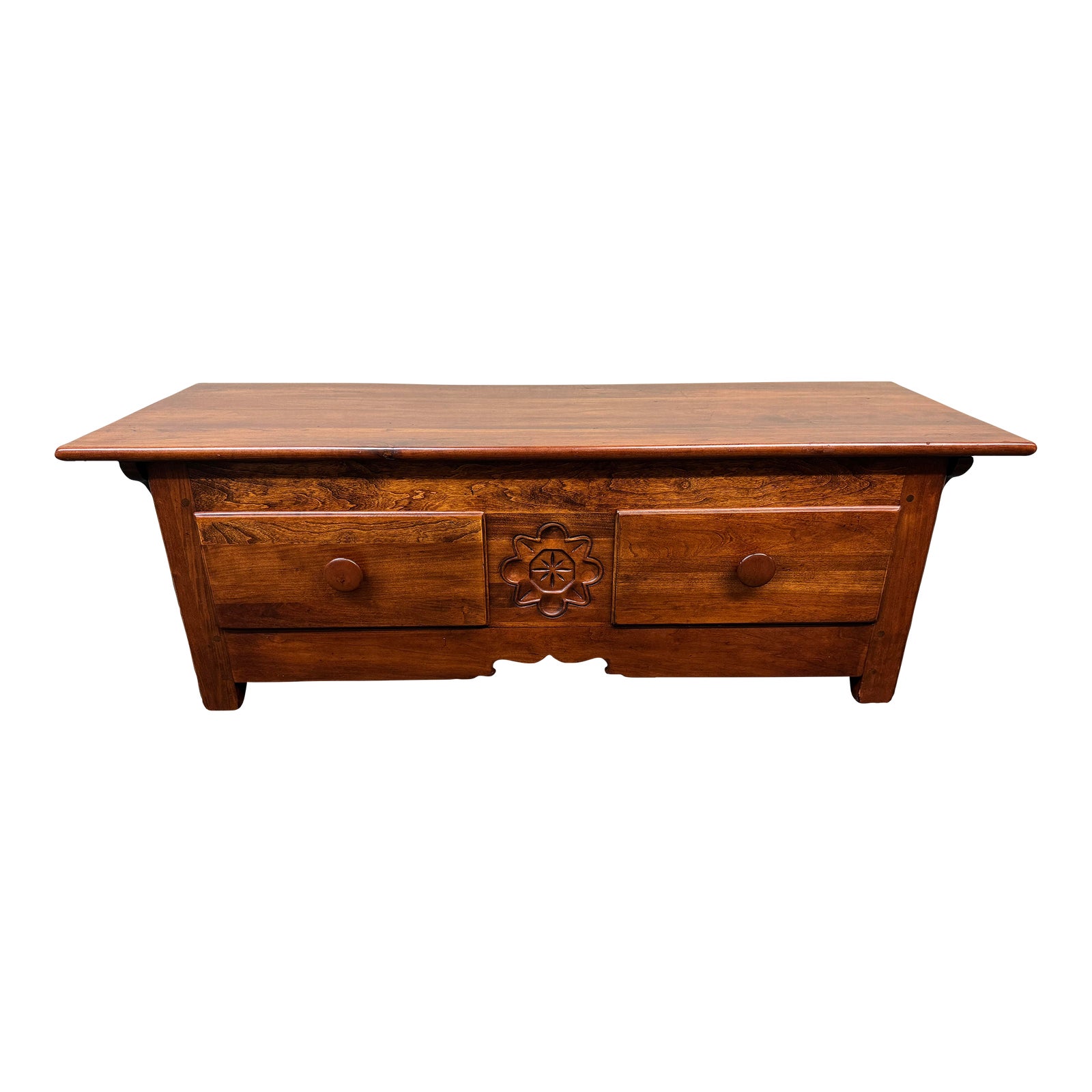 Design Plus Gallery presents an Old Salem Storage Bench by Lexington Furniture. Quality craftsmanship with traditional details that include carved front, dovetail joinery and wide plank top. Light surface wear; condition is consistent with age and use.