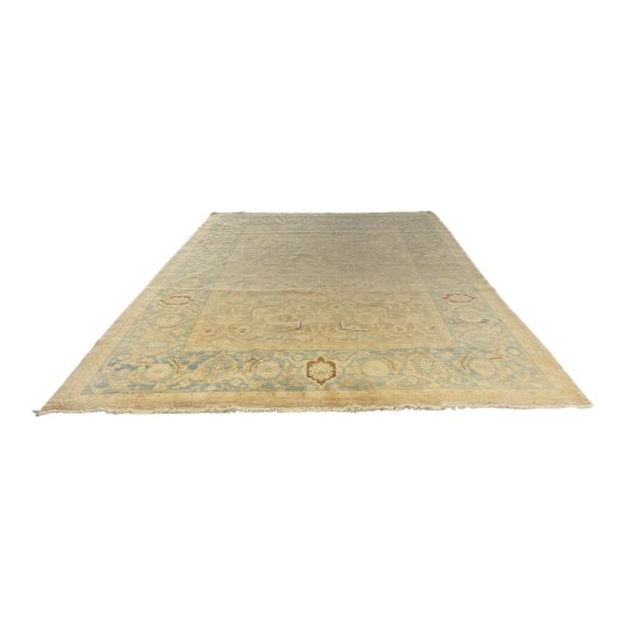 Design Plus Gallery presents a 9ft 3in X 12ft 4in Light Blue + Cream Oushak Rug. Tight pile construction with 100% wool fibers are spun into a contemporary Oushak fashion. Large border is a light blue with umber and hushed warm neutrals. A champagne toned field anchors the center. There is visible wear and