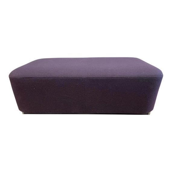 Design Plus Gallery presents a Snowdonia Ottoman by Ligne Roset. Designed by Eric Jourdan for the Snowdonia Collection in 2006. The ottoman rests on a wood plinth base in dark brown / black ebonized wood. Silver matte accents are affixed to both the left and right side of the ottoman. The removable slip cover is in a purple color. Visible and minor wear due to age. Made in France.