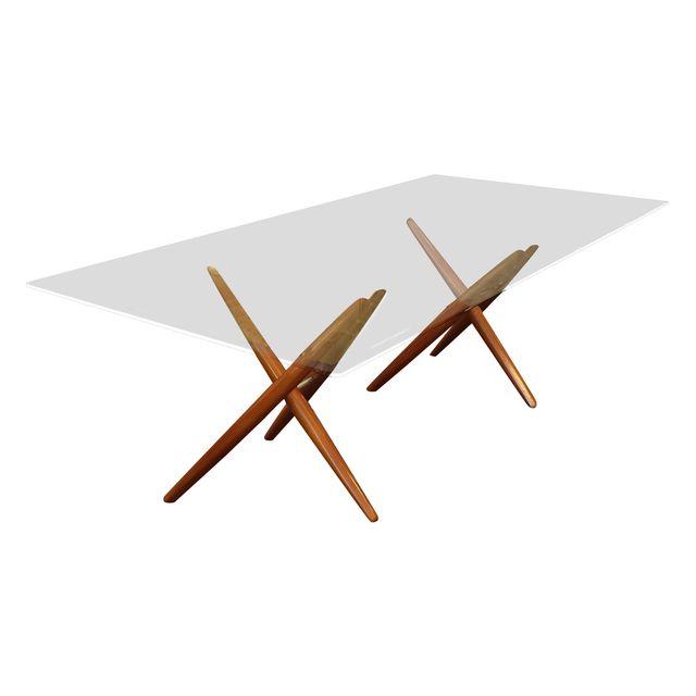 Design Plus Gallery brings us a Ligne Roset Dining Table. Two separate wooden pedestal that supports a large thick glass top. The wood is a warm cherry finish.