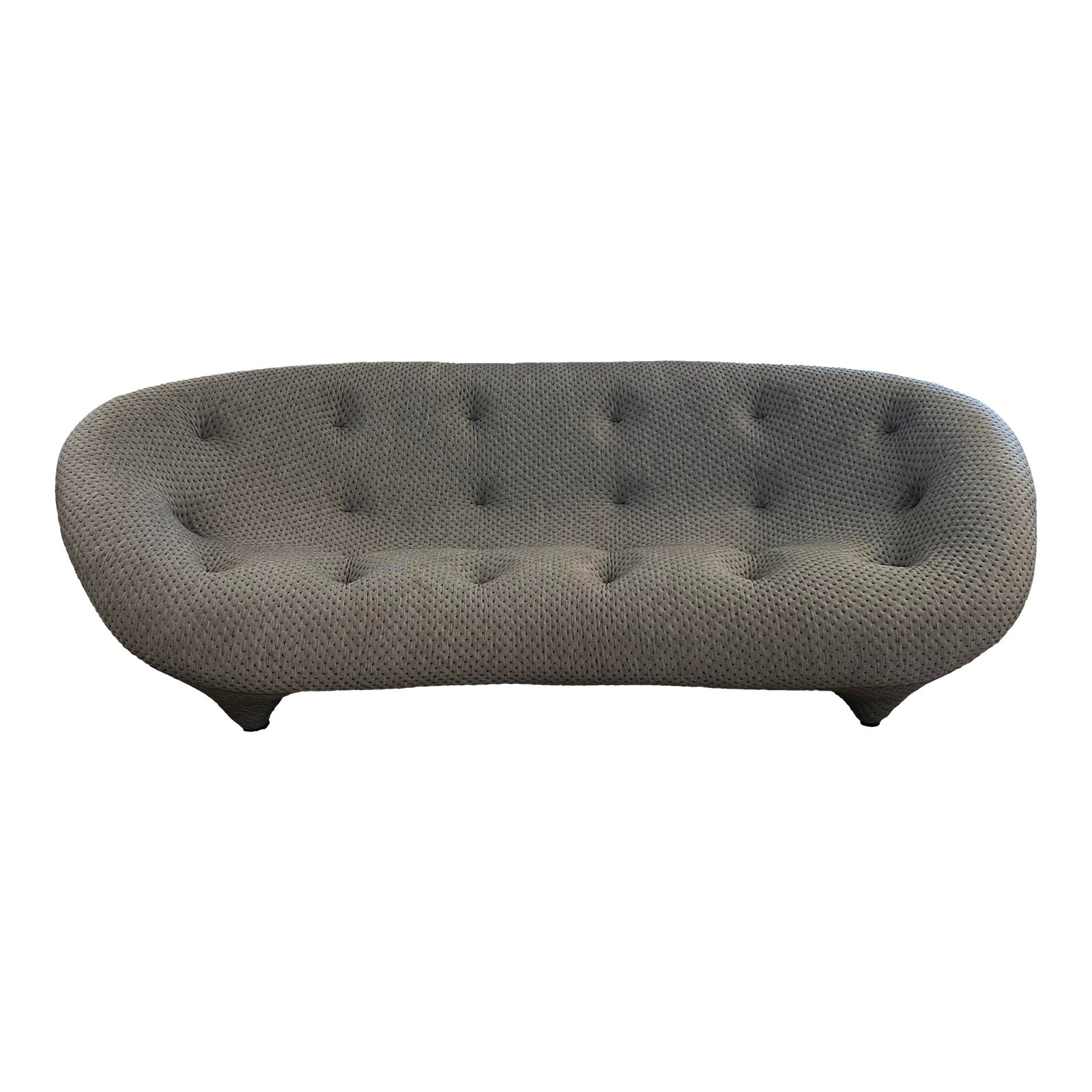 Design Plus Gallery presents the Ploum Sofa by Ligne Roset. Designed by R. & E. Bouroullec, the Ploum sofa is an organic silhouette created by Steel tubing, wire and mesh and then covered a special combination of stretchable quilted covering (wool/synthetic in Anthracite Gray) and ultra-soft foam. This combination, along with deep tufting and ample dimensions, provides extreme comfort and accommodates different ways of lounging. By design, the Ploum is asymmetrical in construction with right-hand backrest a bit higher than the left, was well as right-hand seat is slightly deeper than the left-hand. This is the high back version of the Ploum. Cover is not removable. Light surface wear, condition is consistent with age and use.