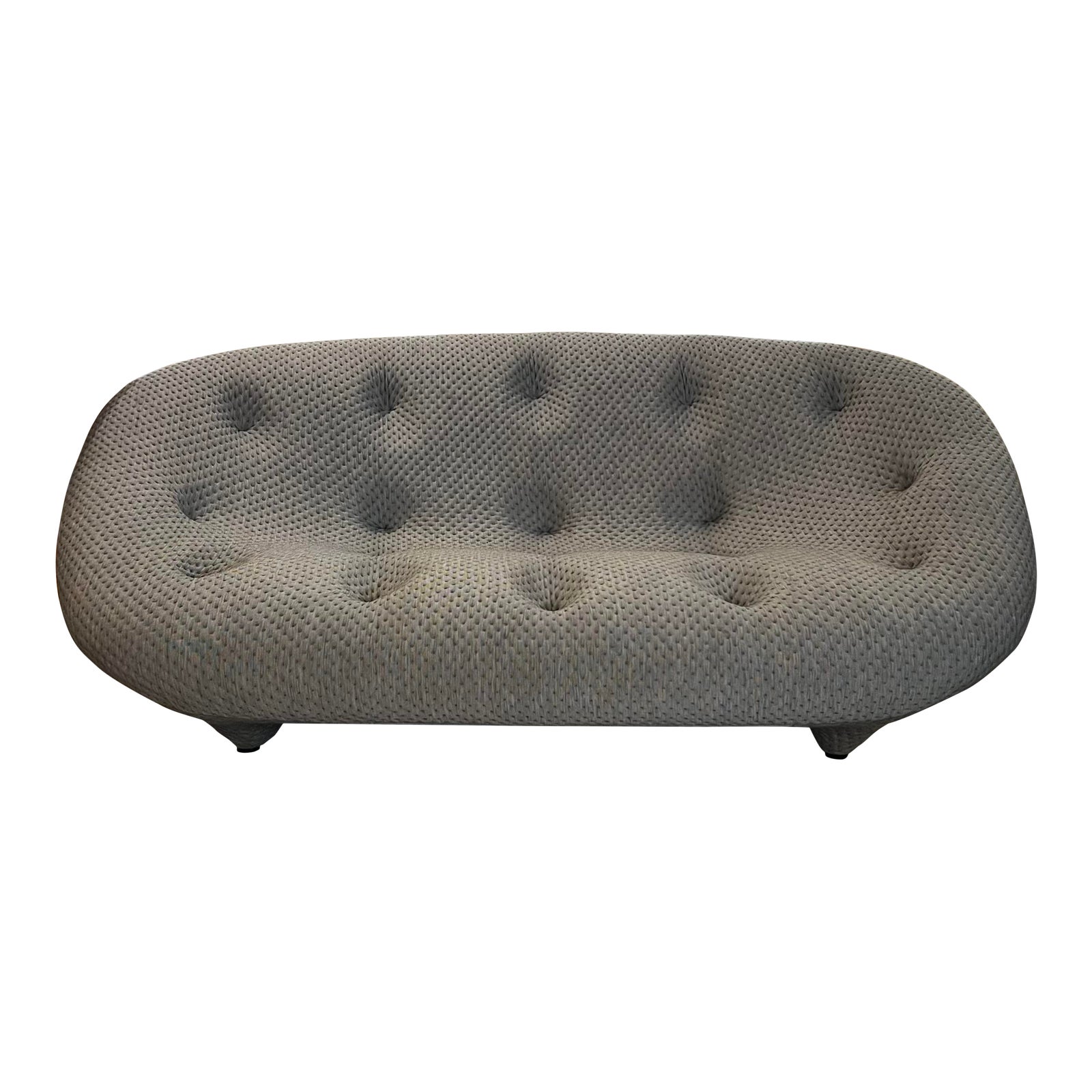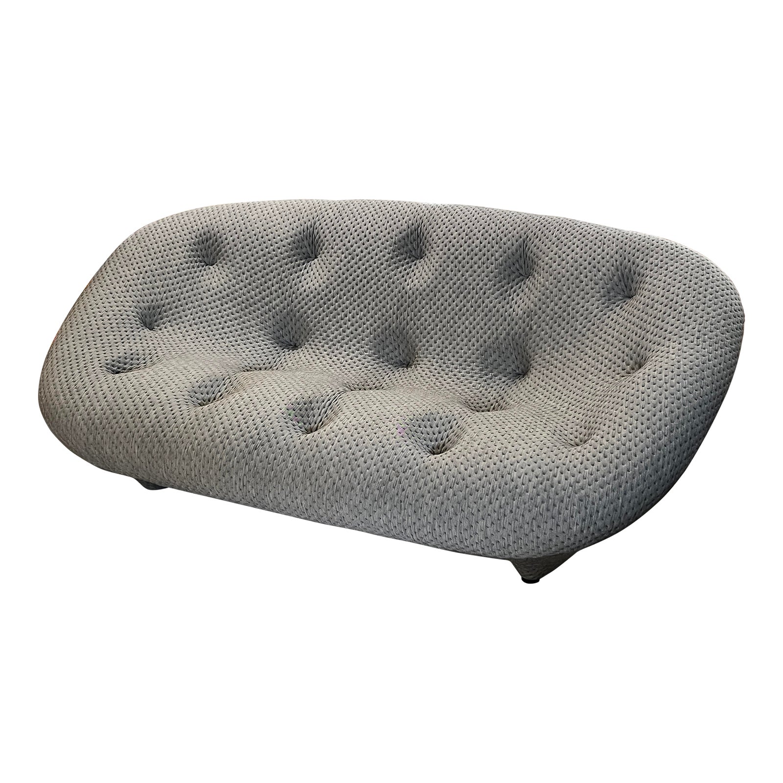 Design Plus Gallery presents the Ploum Sofa by Ligne Roset. Designed by R. & E. Bouroullec, the Ploum sofa is an organic silhouette created by steel tubing, wire and mesh and then covered a special combination of stretchable quilted covering (wool/synthetic in Anthracite Gray) and ultra-soft foam. This combination, along with deep tufting and ample dimensions, provides extreme comfort and accommodates different ways of lounging. By design, the Ploum is asymmetrical in construction with right-hand backrest a bit higher than the left, as well as right-hand seat is slightly deeper than the left-hand. This is the high back version of the Ploum. Cover is not removable. Light surface wear, condition is consistent with age and use.