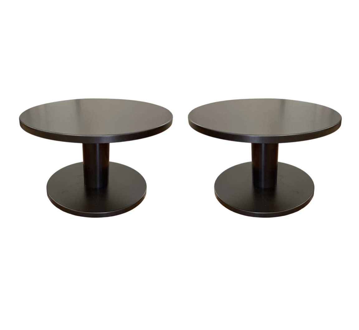 Design Plus Gallery presents a Ligne Roset Satin Black Metal Side Tables. Modern and simple spool like silhouette has a larger over hang for surface area. Metal has a semi reflective satin matte black finish with slight warmth. Minor wear, good condition. Table is an older model discontinued from Ligne Roset. Positioned low for a lounging vibe.