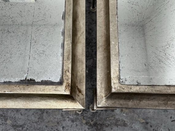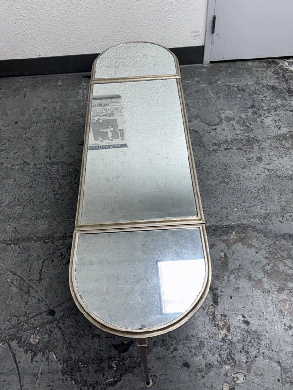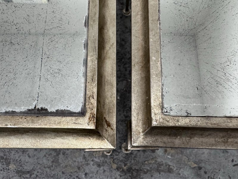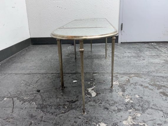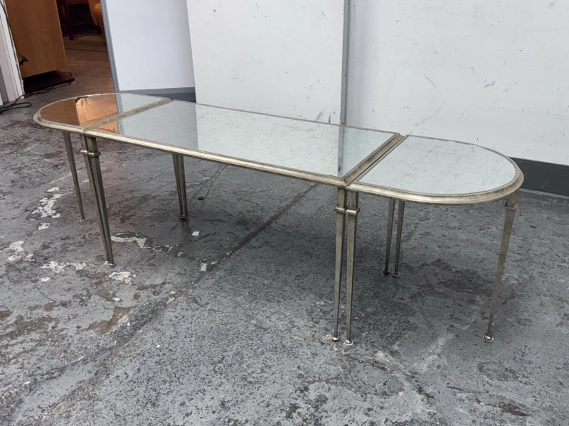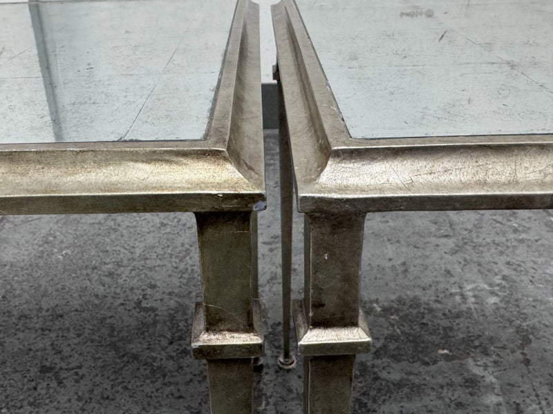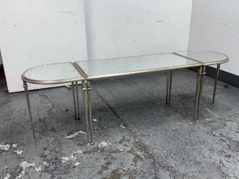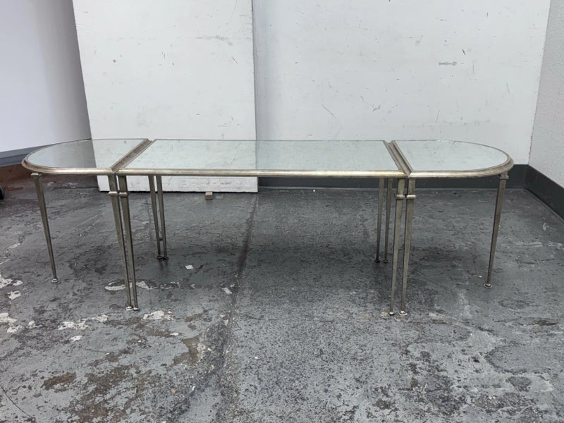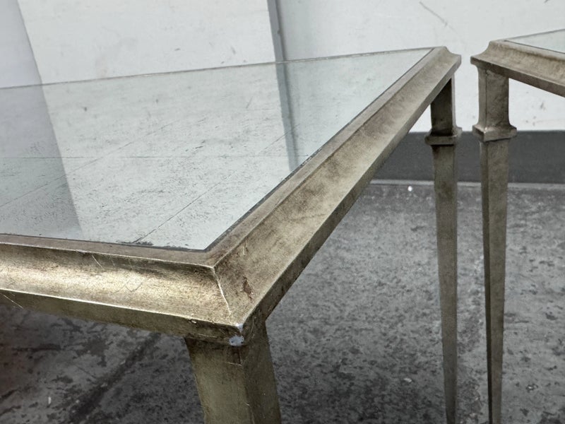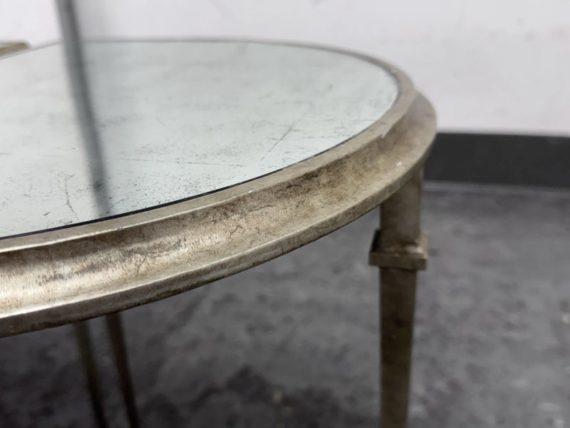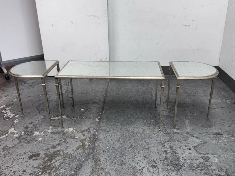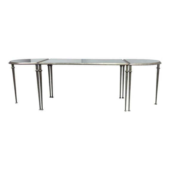 Design Plus Gallery presents a Set of Three Tables, The Tria from Drexel Heritage Designed by Lillian August. The set is crafted in metal with hand finished silver leafing, mixed with stunning Eglomise mirrors, these Tria”s are a jewelry piece that works in a variety of decors. They are all in good condition with wear that is consistent with usage.