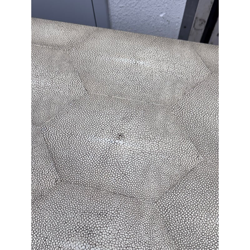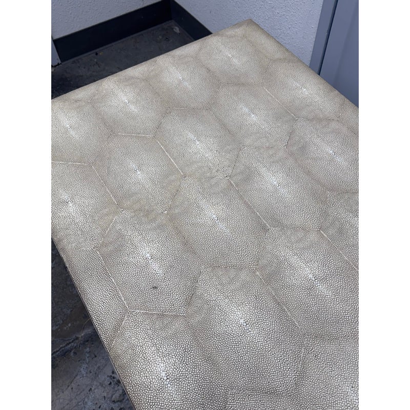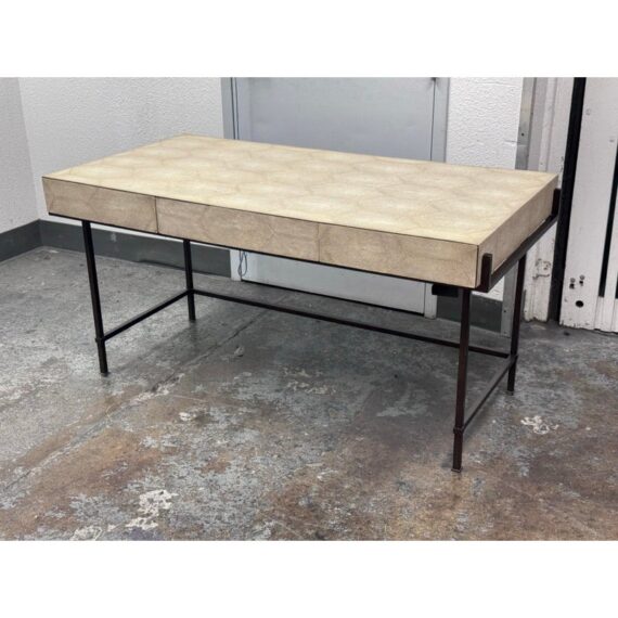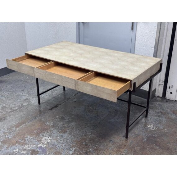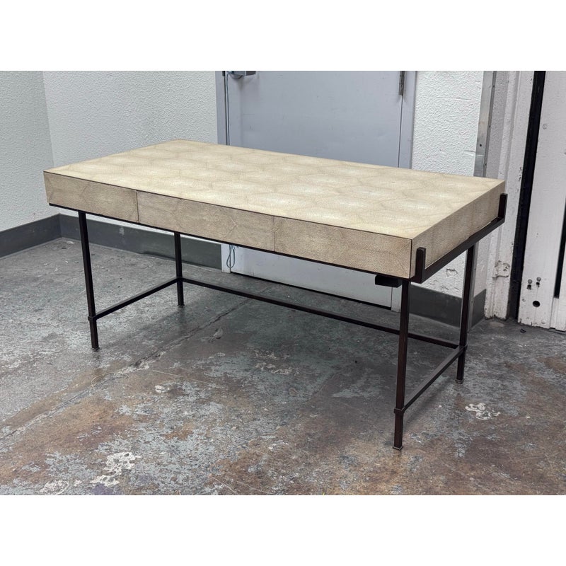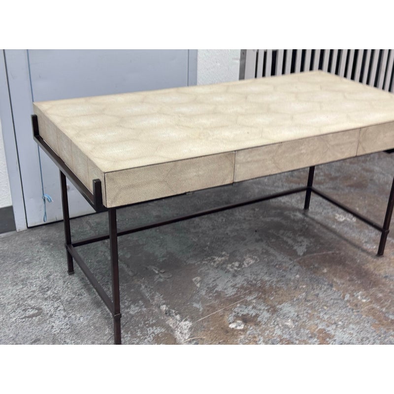 Design Plus Gallery presents the Simone Shagreen Desk by Lillian August for Hickory White. This box on stand designed desk offers a stylishly contemporary flair combining the three drawer taupe shagreen top with the square iron base in a wonderfully textured bronze finish. A nod to luxury with effortless style and dynamic presence. It is in good condition with a small chip to the texture, as shown. Made in the USA.