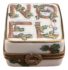 Design Plus Gallery presents a Porcelain Trinket Box with NOEL from Limoges, France. The piece has been lovingly hand painted and signed by Rochard. Each capitol letter is in a dark bronze finish with Christmas ornaments and mistletoe done by hand. The closer is in a gold metal with a wreath for a closure. Is in good condition with minimal wear, no chips or cracks.