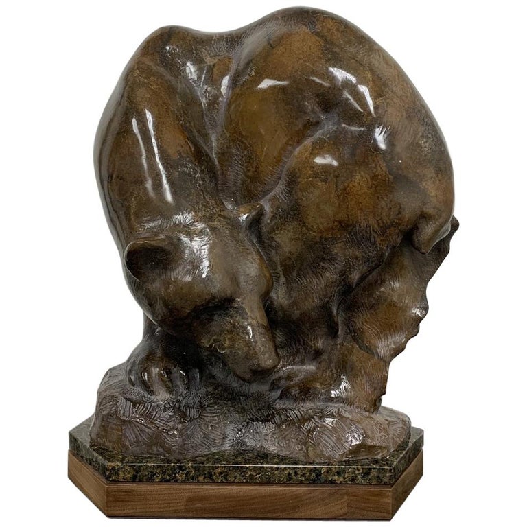 Design Plus Gallery presents a “Awakening” Bear Bronze Cast Metal Sculpture by Lincoln Fox. Bear is captured in a quote moment reaching back in a beautifully arched posed with artist’s signature in the lower right. Sculpture sits atop marble and wood base.