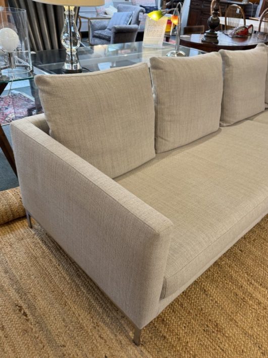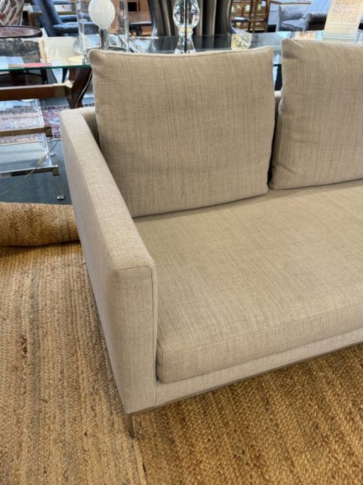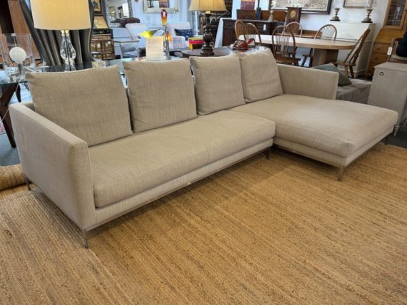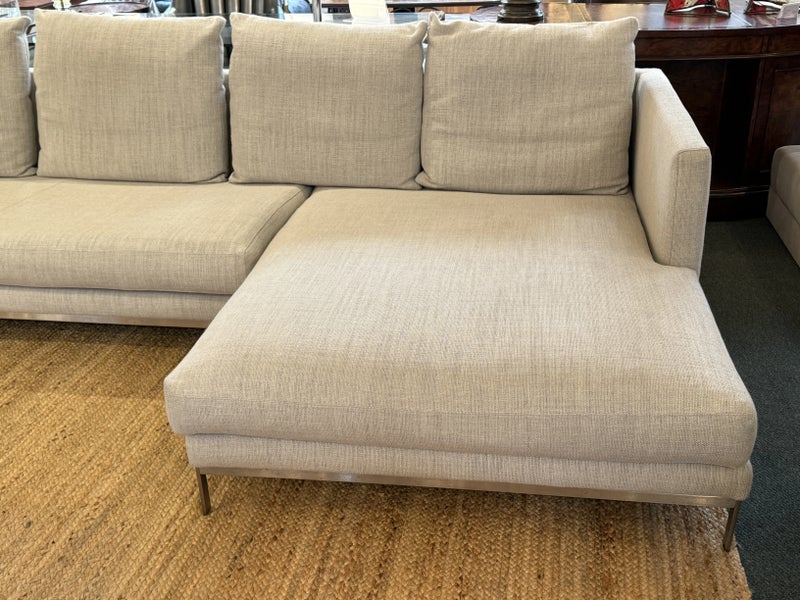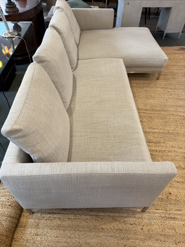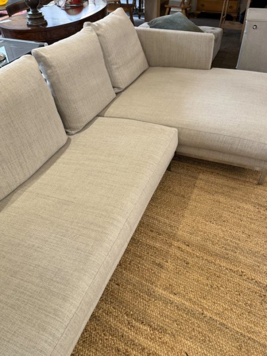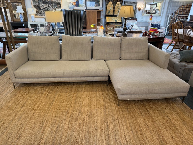 Design Plus Gallery presents the Relax Sectional by Linteloo, made in Italy. The ultimate in comfort, the Relax 2pc was designed by renowned Dutch designer Jan des Bouvrie in 2016. The low profile is both elegant and unobtrusive, joined together by a steel coupling system. The down-wrapped + memory foam loose back cushions can be easily rearranged offering great versatility in terms of lay-out and use. The comfortable sectional is elevated on stainless steel legs. Light surface wear; condition is good for age and use.